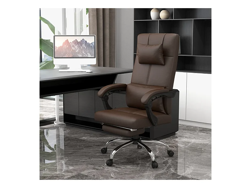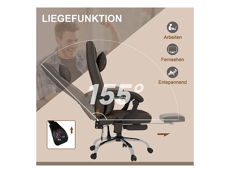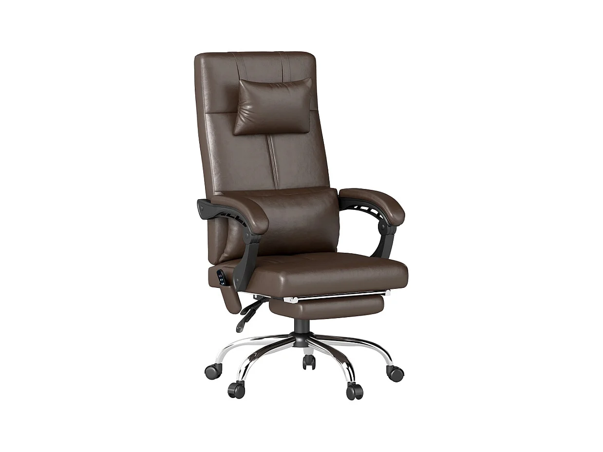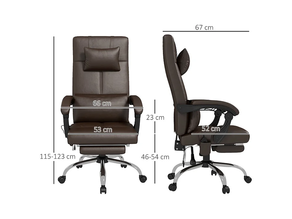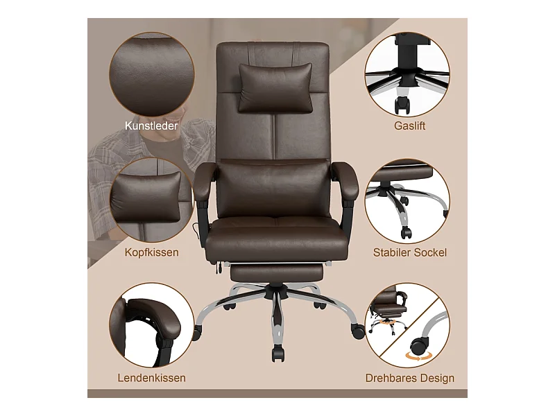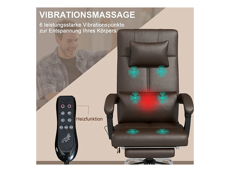 Fauteuil de bureau ergonomique avec massage, chauffage, inclinaison et repose-pieds, simili cuir, café (66x67x123 cm)