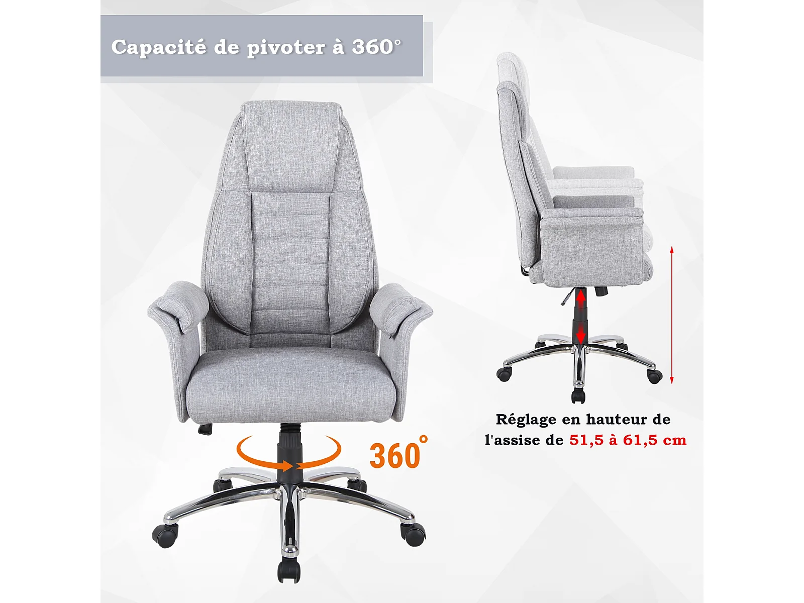 Fauteuil de bureau direction massant chauffant hauteur réglable dossier inclinable toile de lin gris chiné