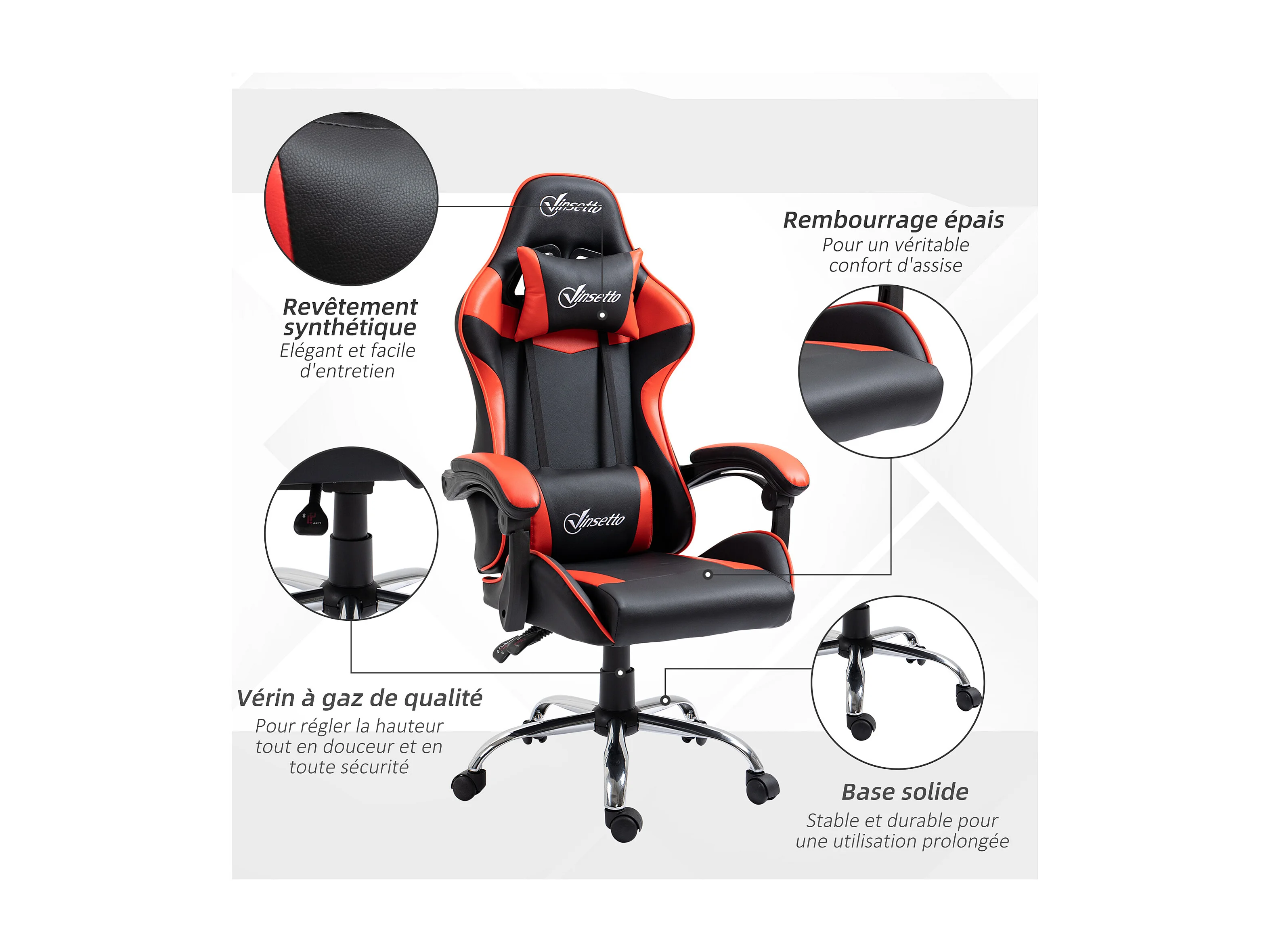 Fauteuil de bureau gamer style baquet racing - pivotant, inclinable - coussins tétière et lombaires inclus - revêtement PU rouge noir