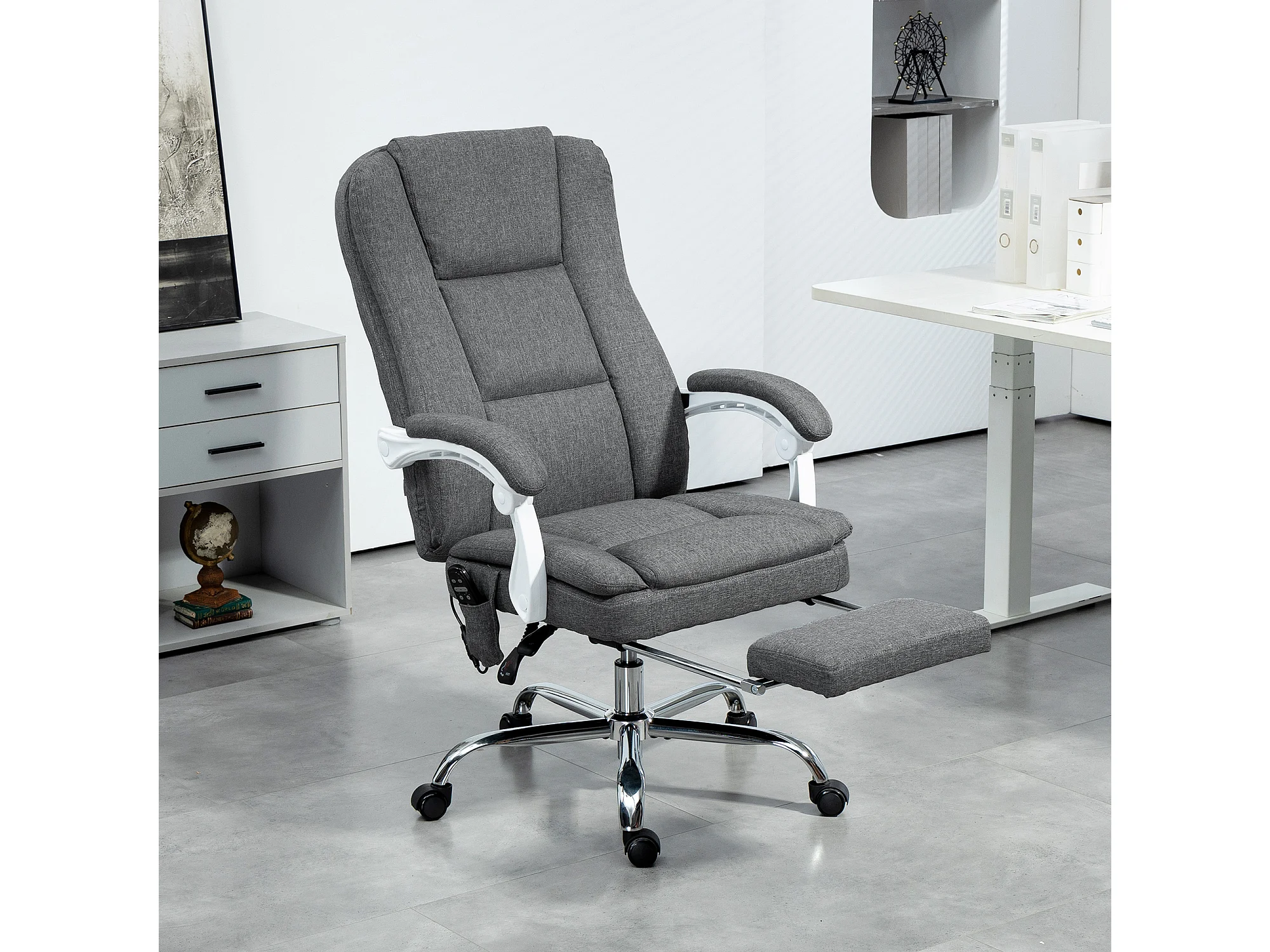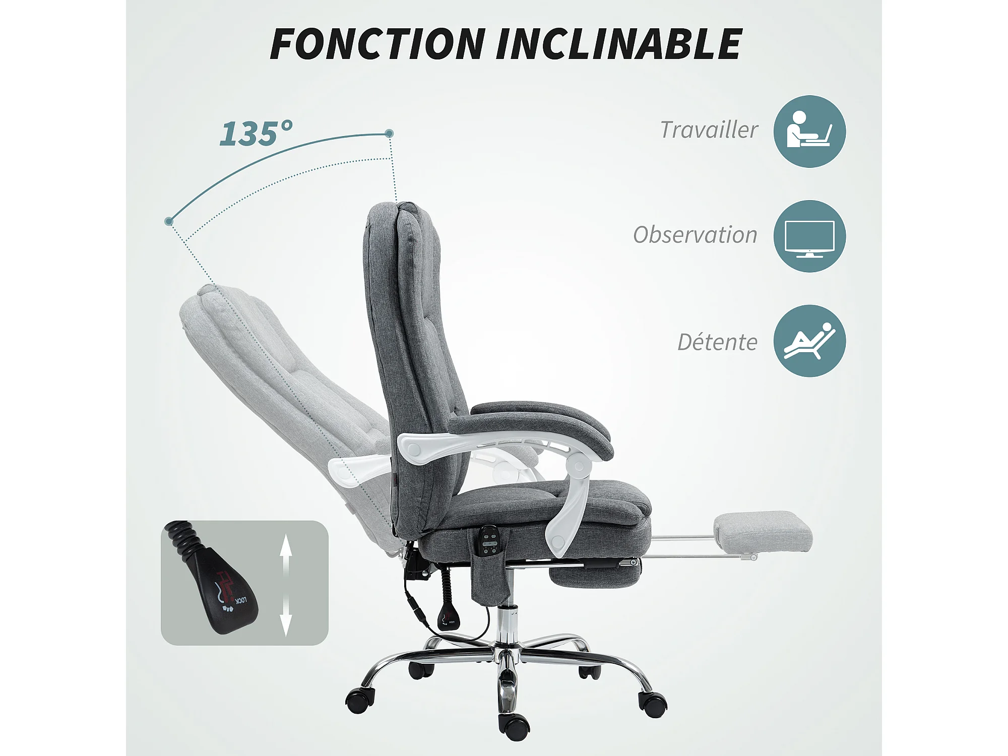 Fauteuil de bureau massant chauffant inclinable repose-pieds rétractable tissu toucher lin gris