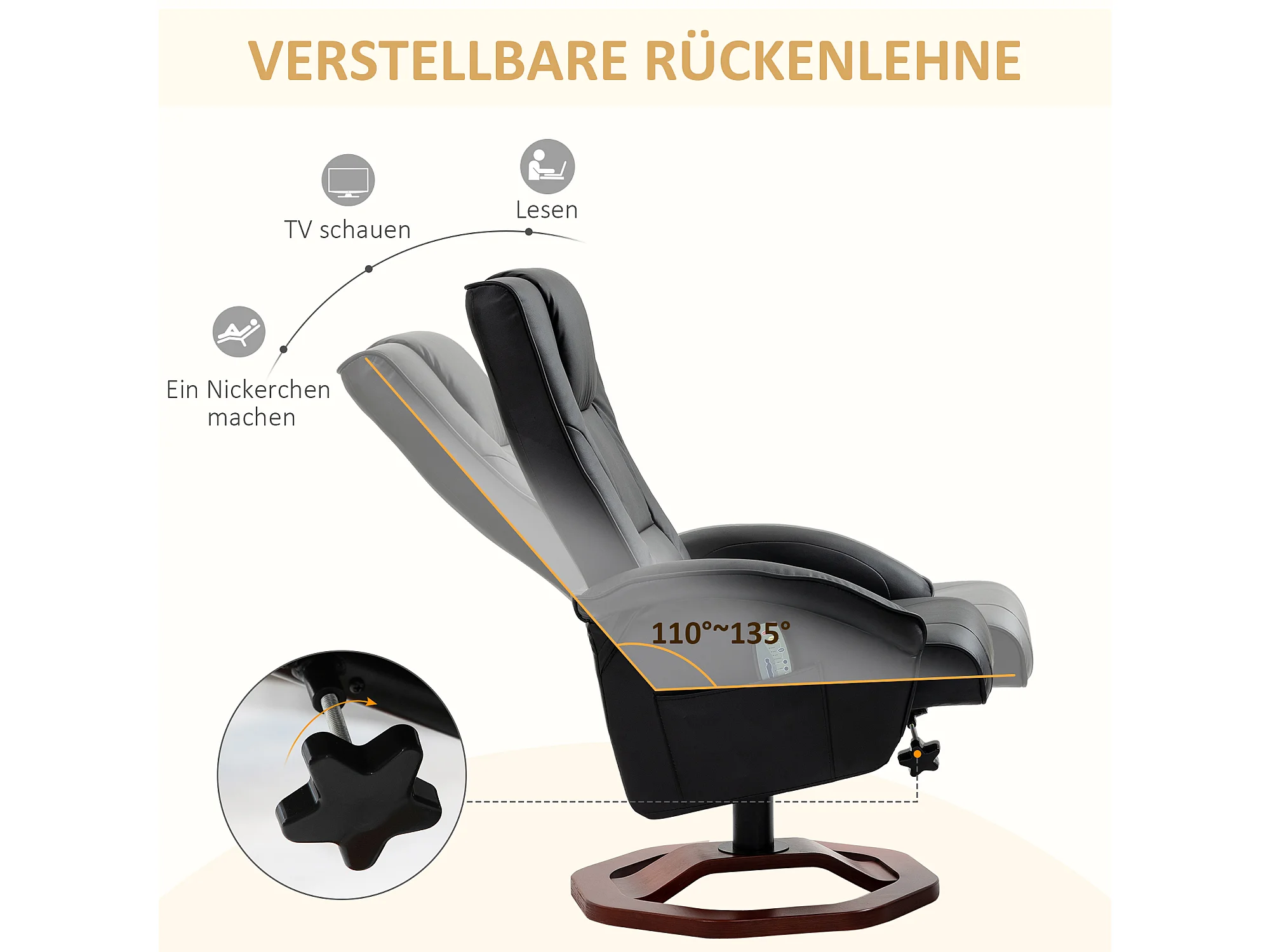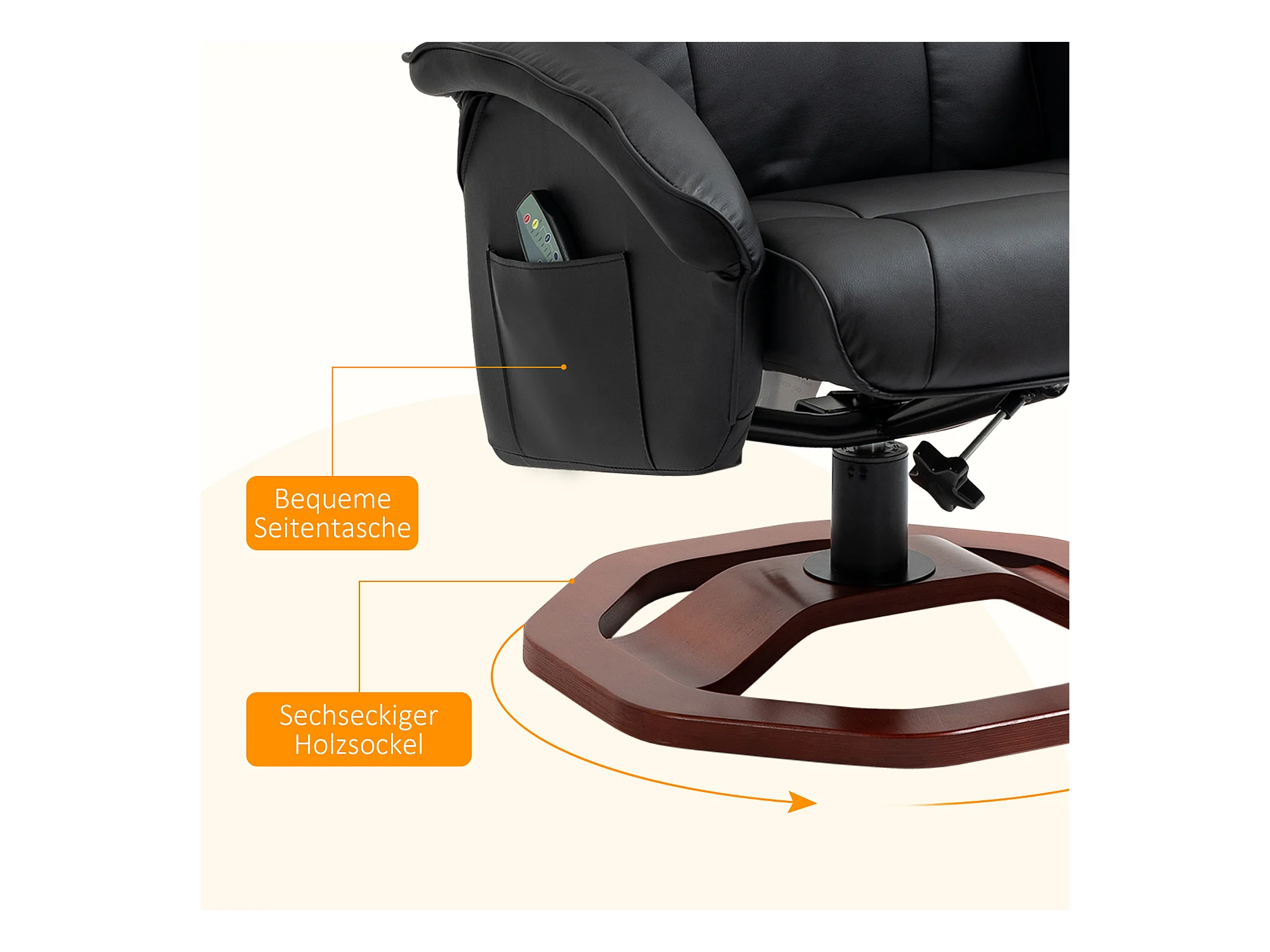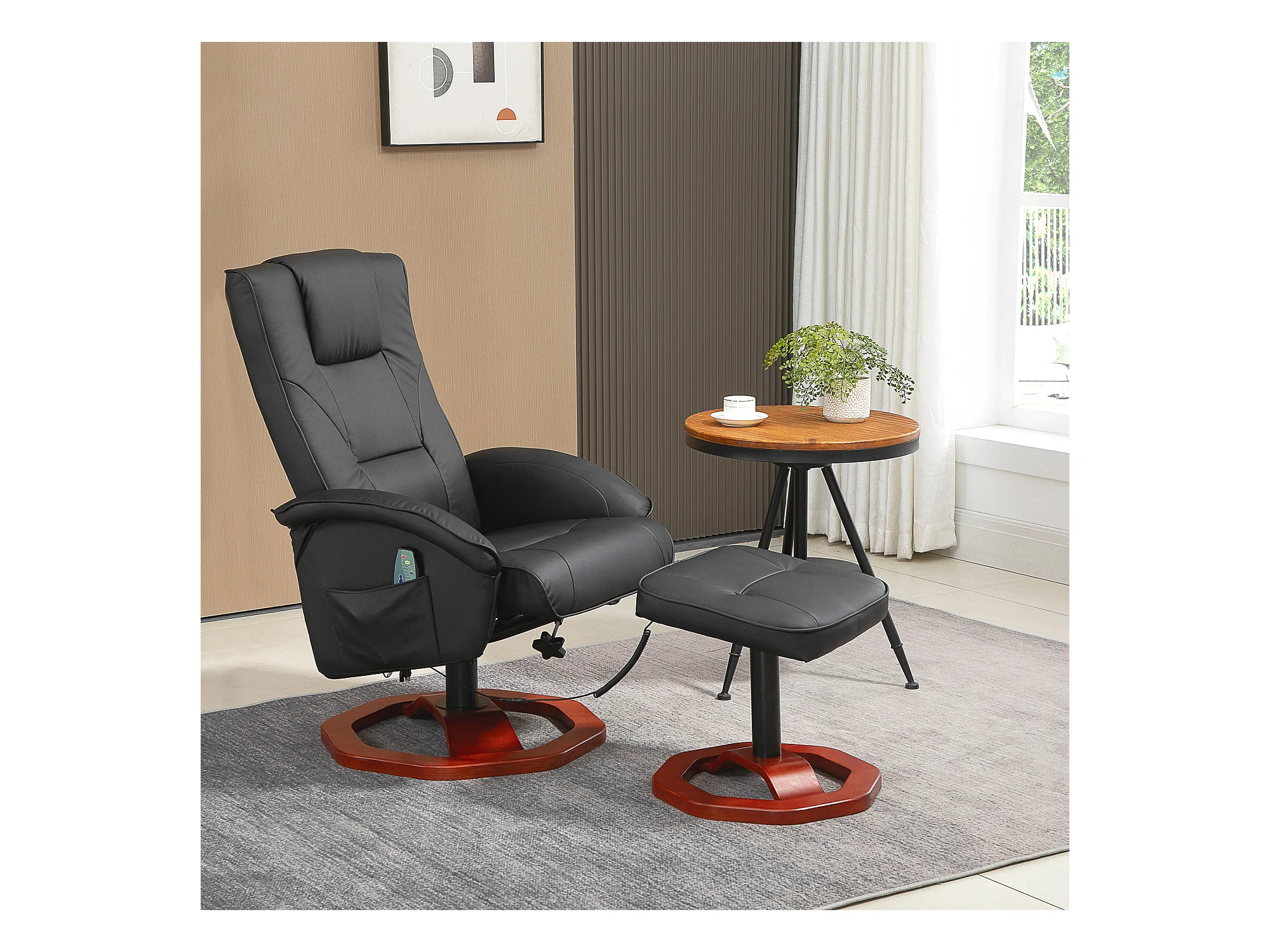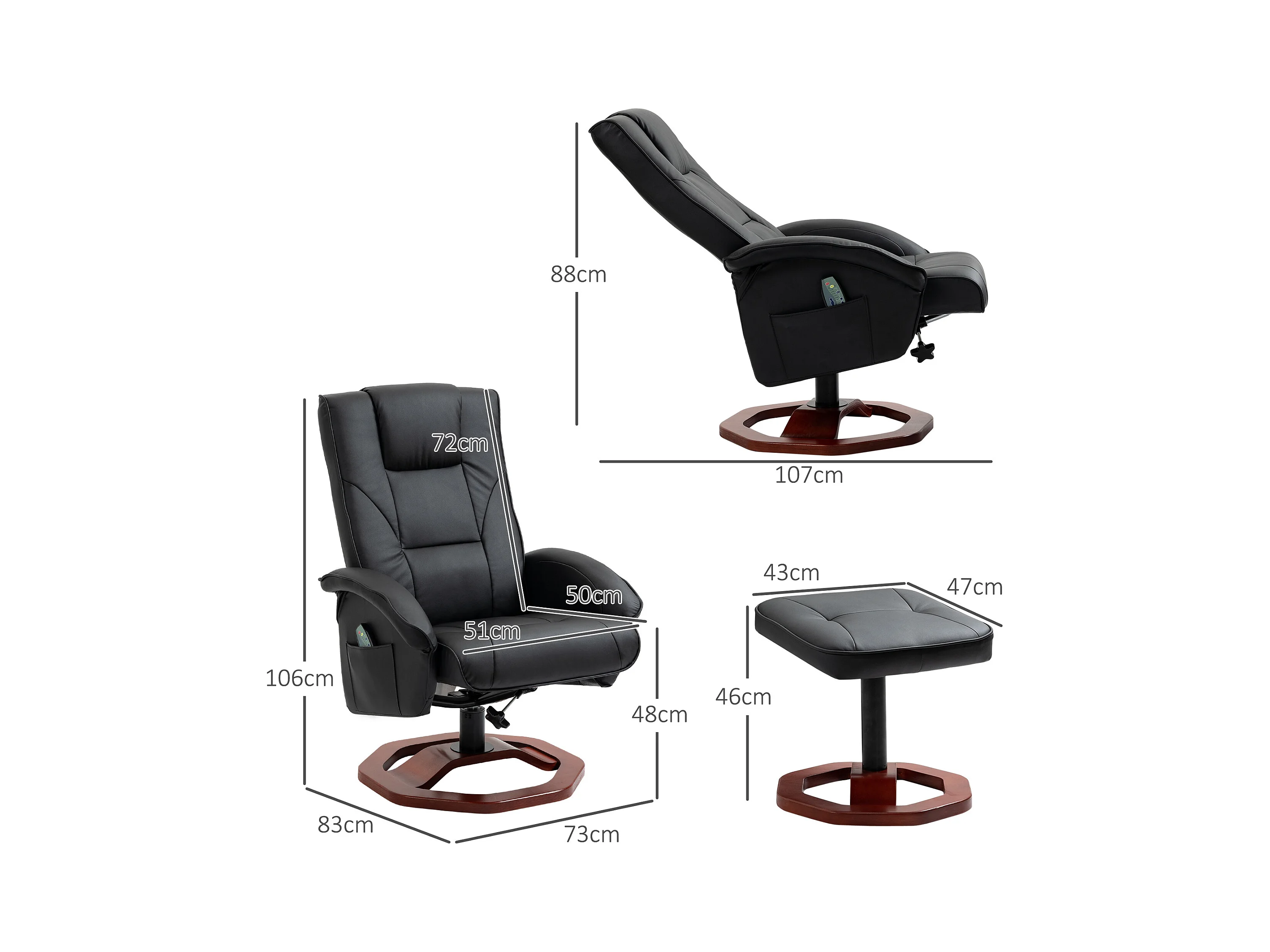 Fauteuil de massage pivotant 360°, simili cuir noir, avec repose-pieds, inclinable (73x83x106cm)