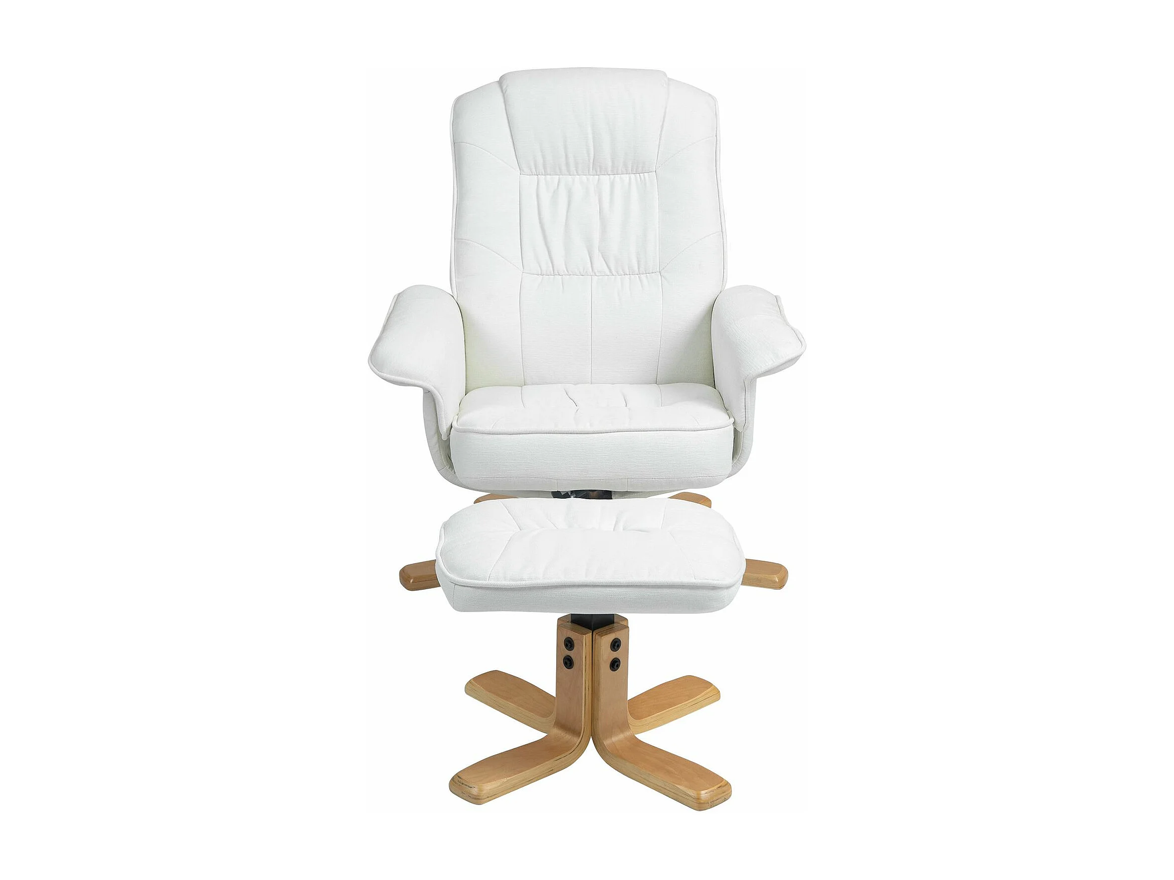 Fauteuil de relaxation CHALY avec repose-pieds pouf siège pivotant dossier inclinable assise rembourrée relax, en tissu blanc