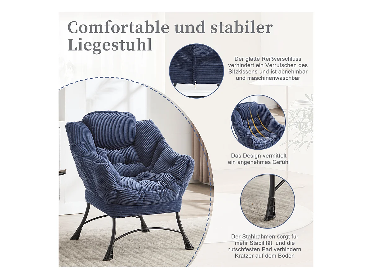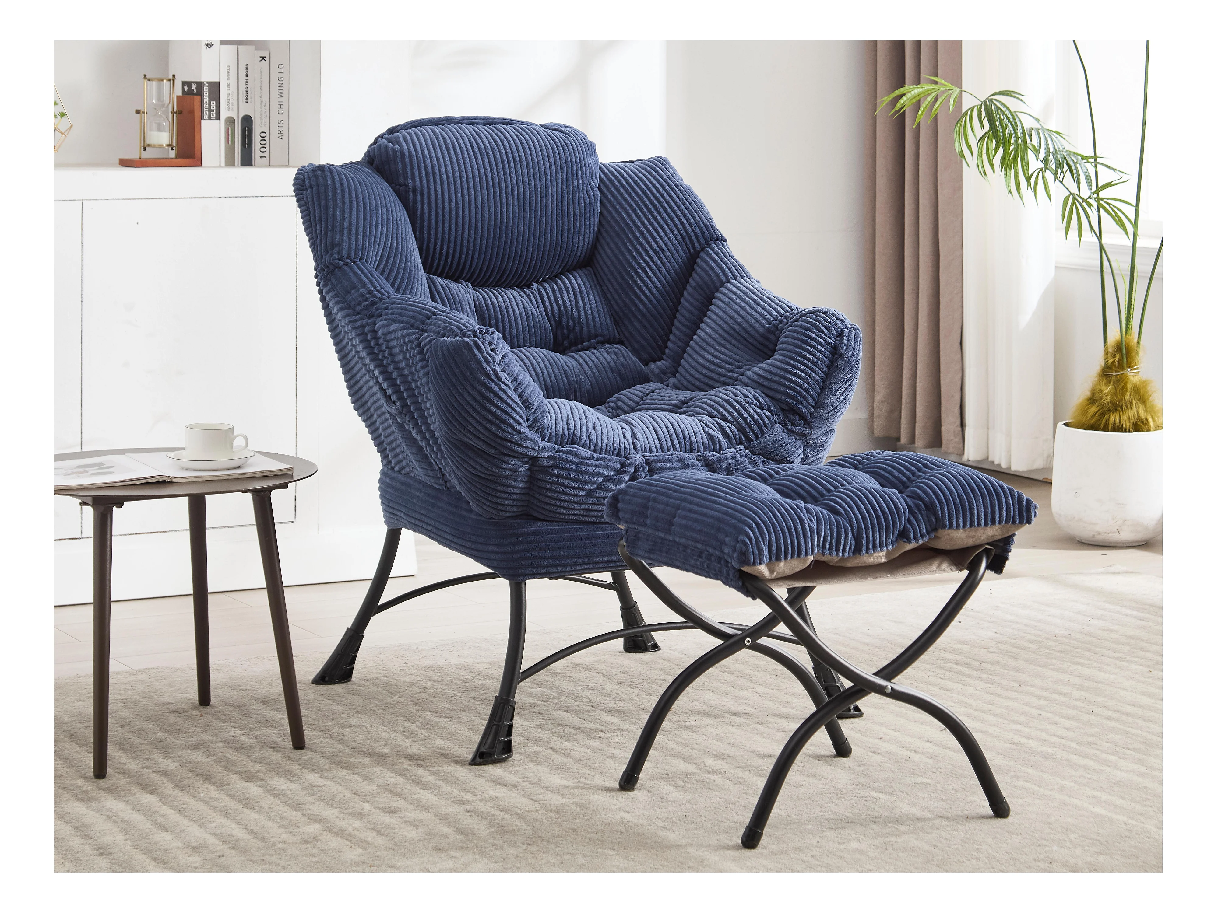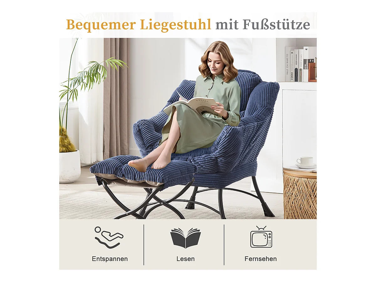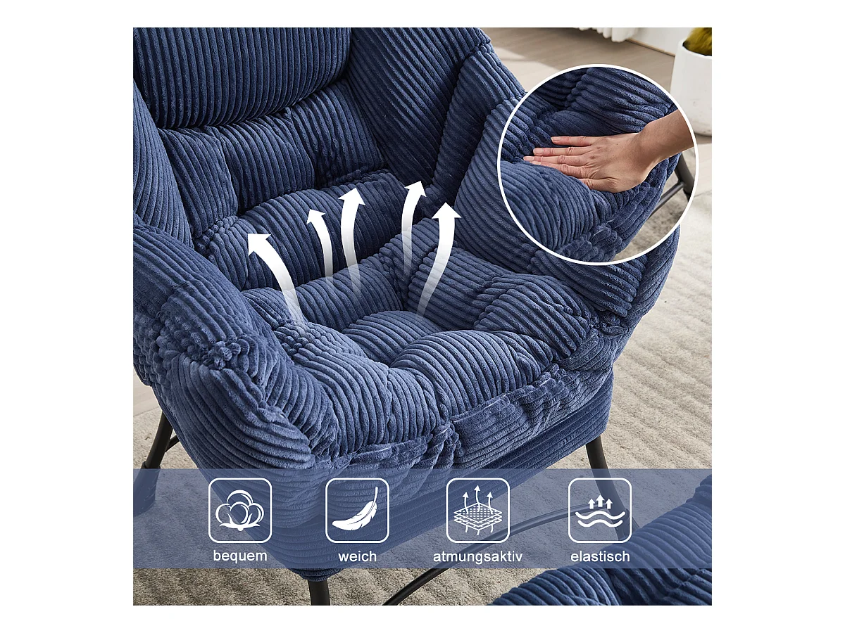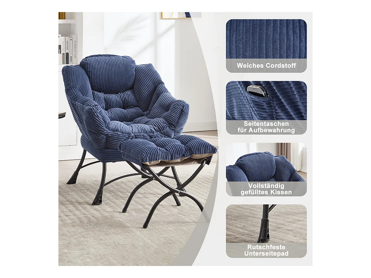 Fauteuil en velours côtelé bleu - Repose-pieds pratique - Poche latérale pour téléphone - Style moelleux et spacieux - Parfait pour salon ou chambre