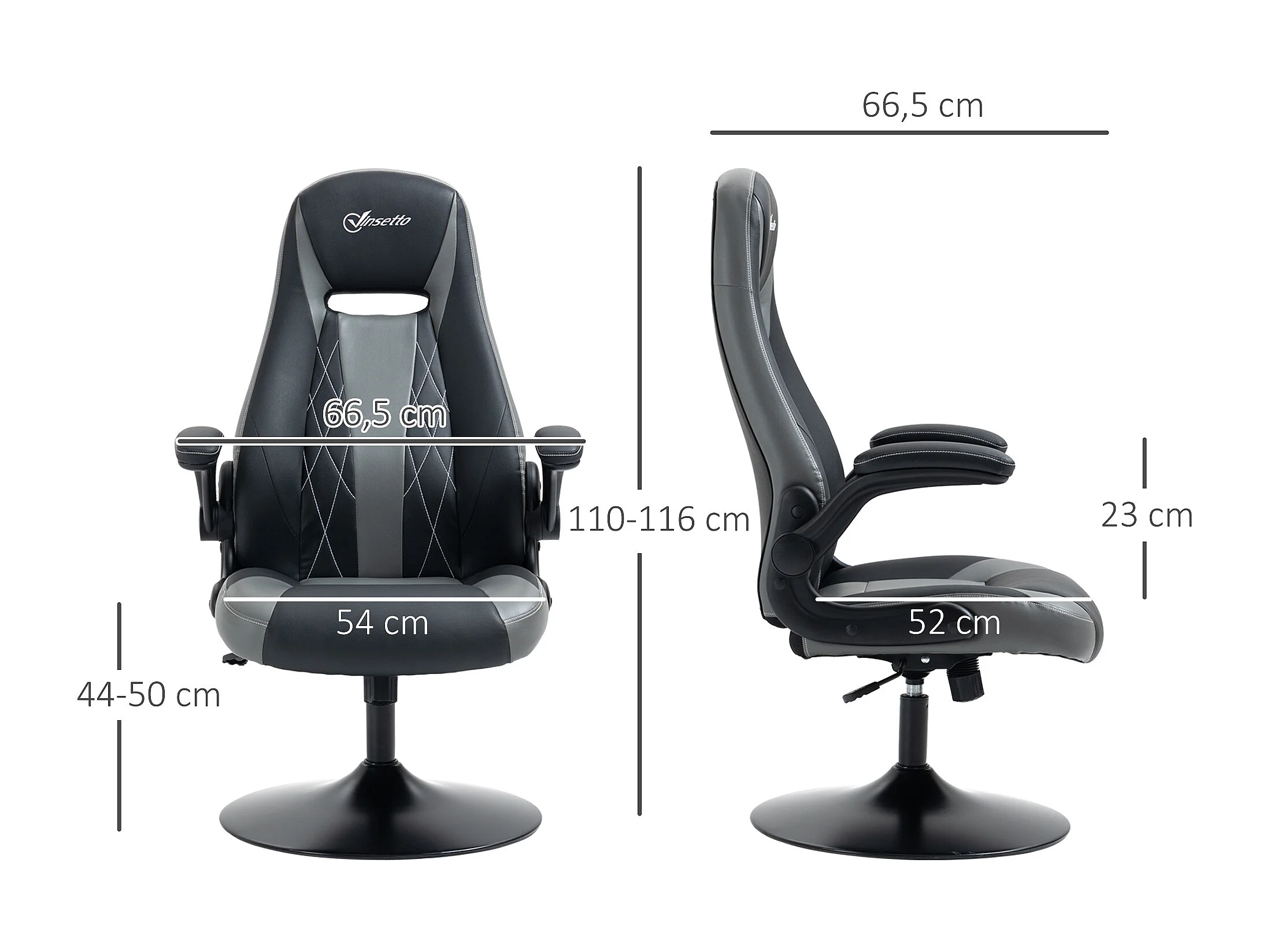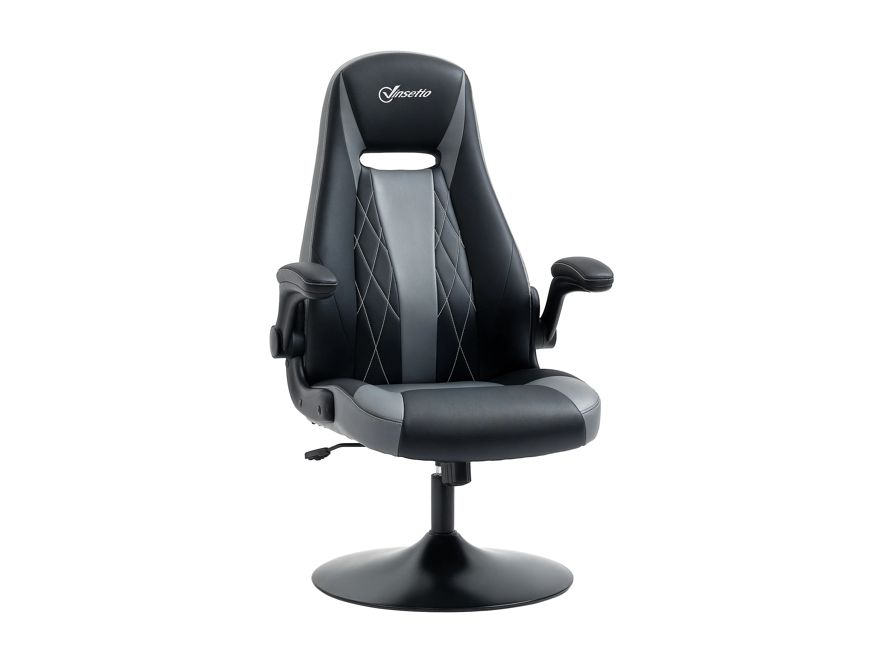 Fauteuil gaming base ronde métal pivotante 360° hauteur réglable tétière accoudoirs relevables PVC gris noir