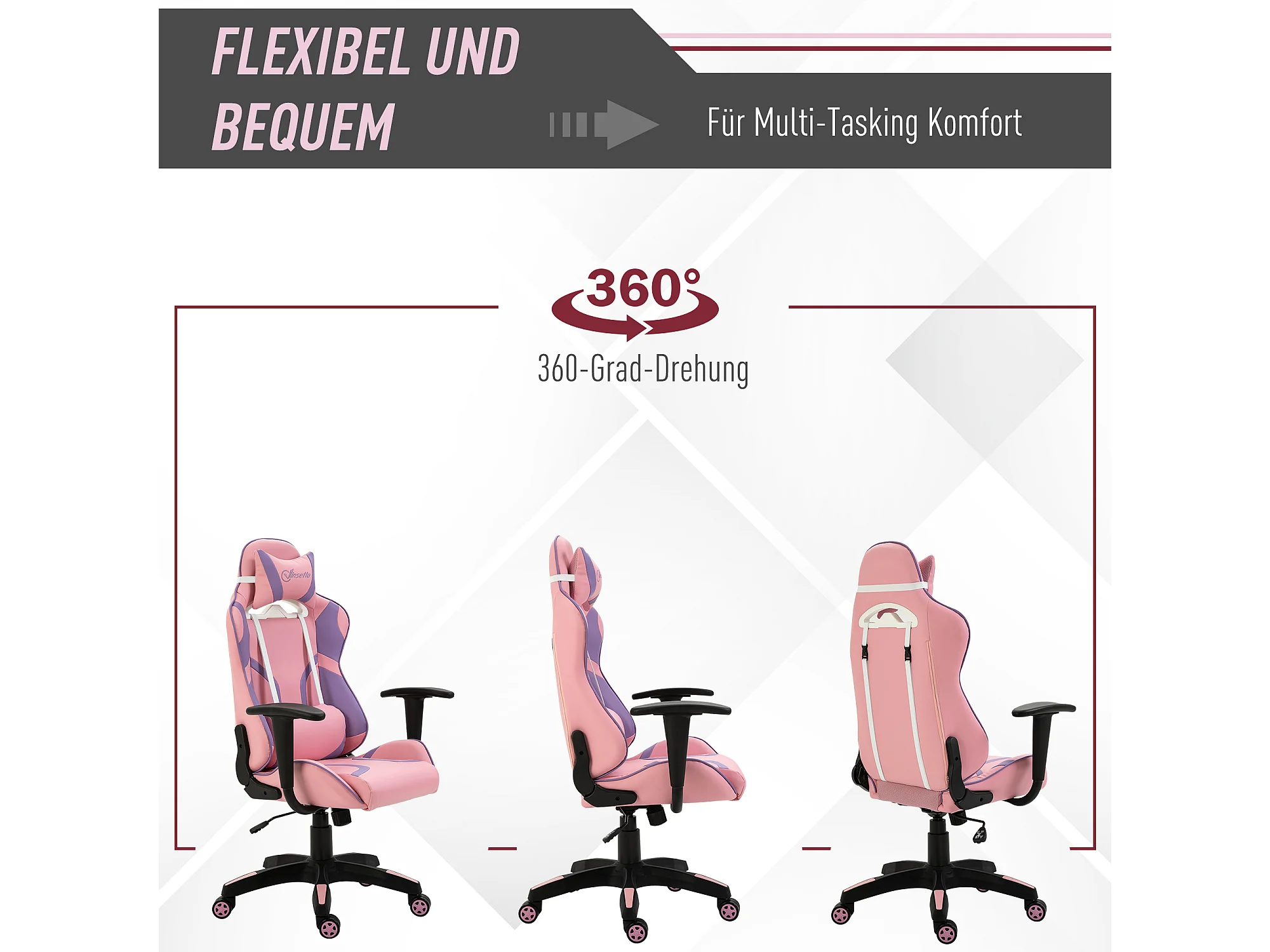 Fauteuil gaming ergonomique avec coussin massage réglable, mousse, rose et violet (69x56x125.5cm)