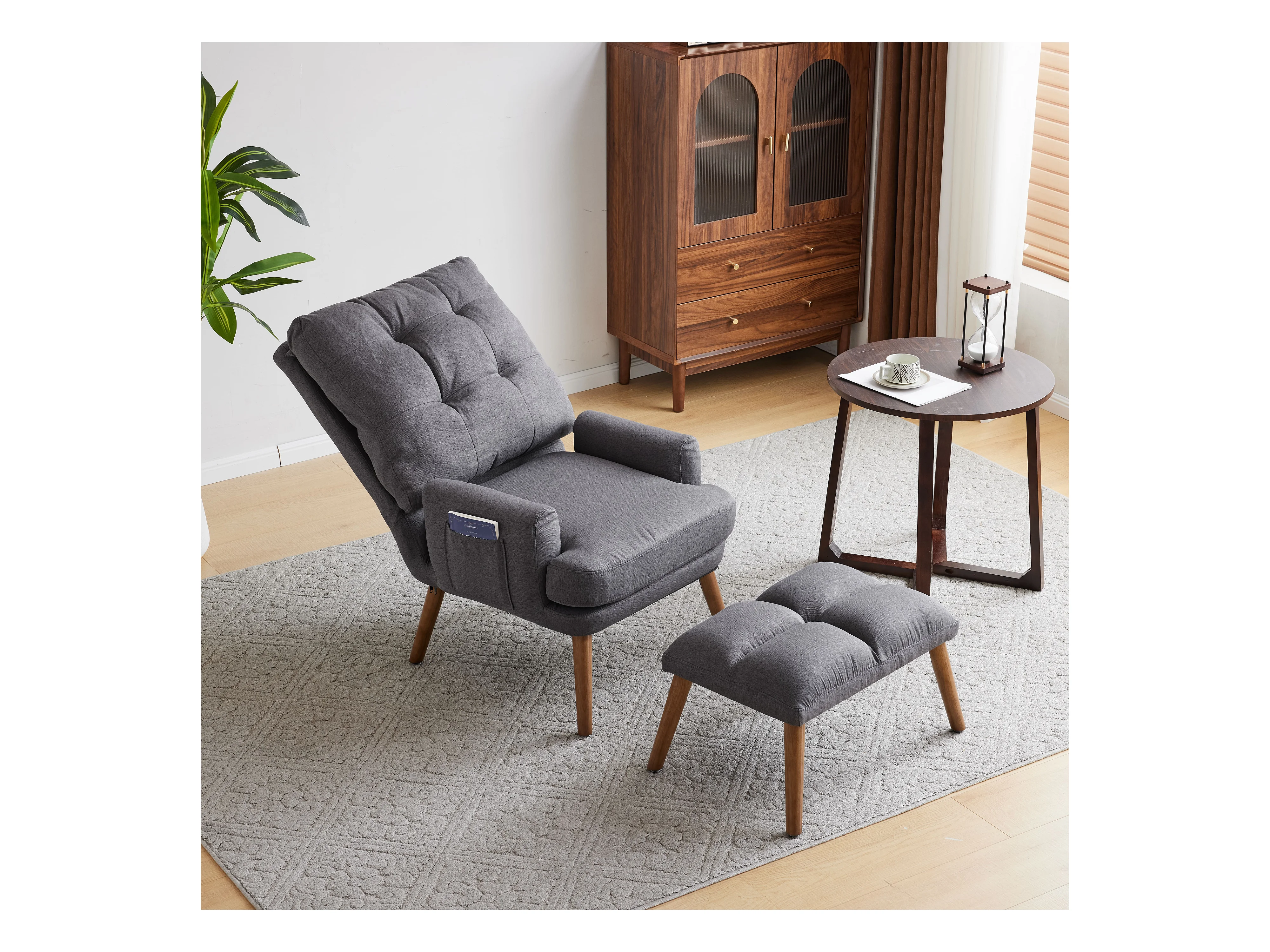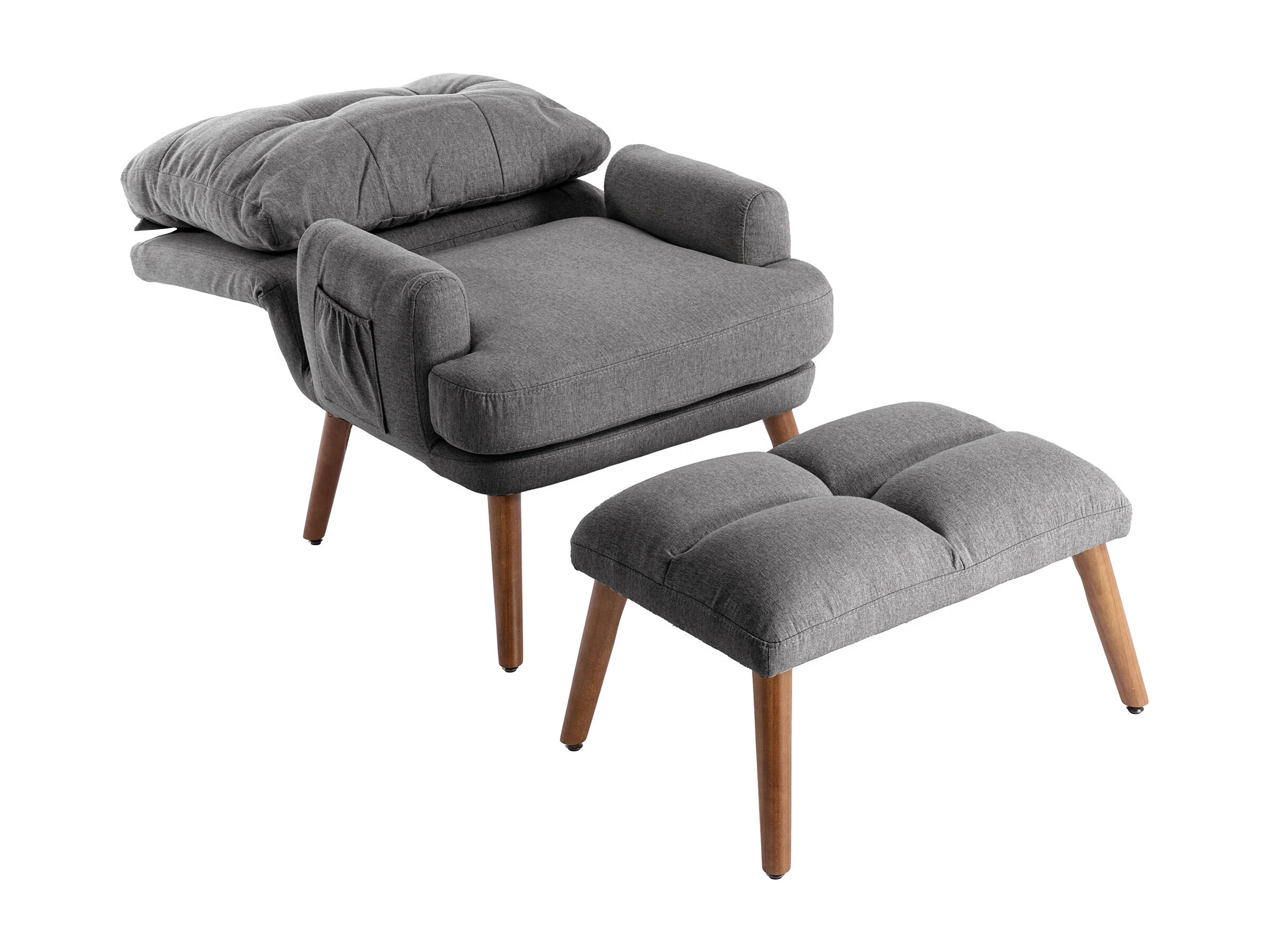 Fauteuil gris avec repose-pieds et poches latérales, dossier réglable sur 5 niveaux