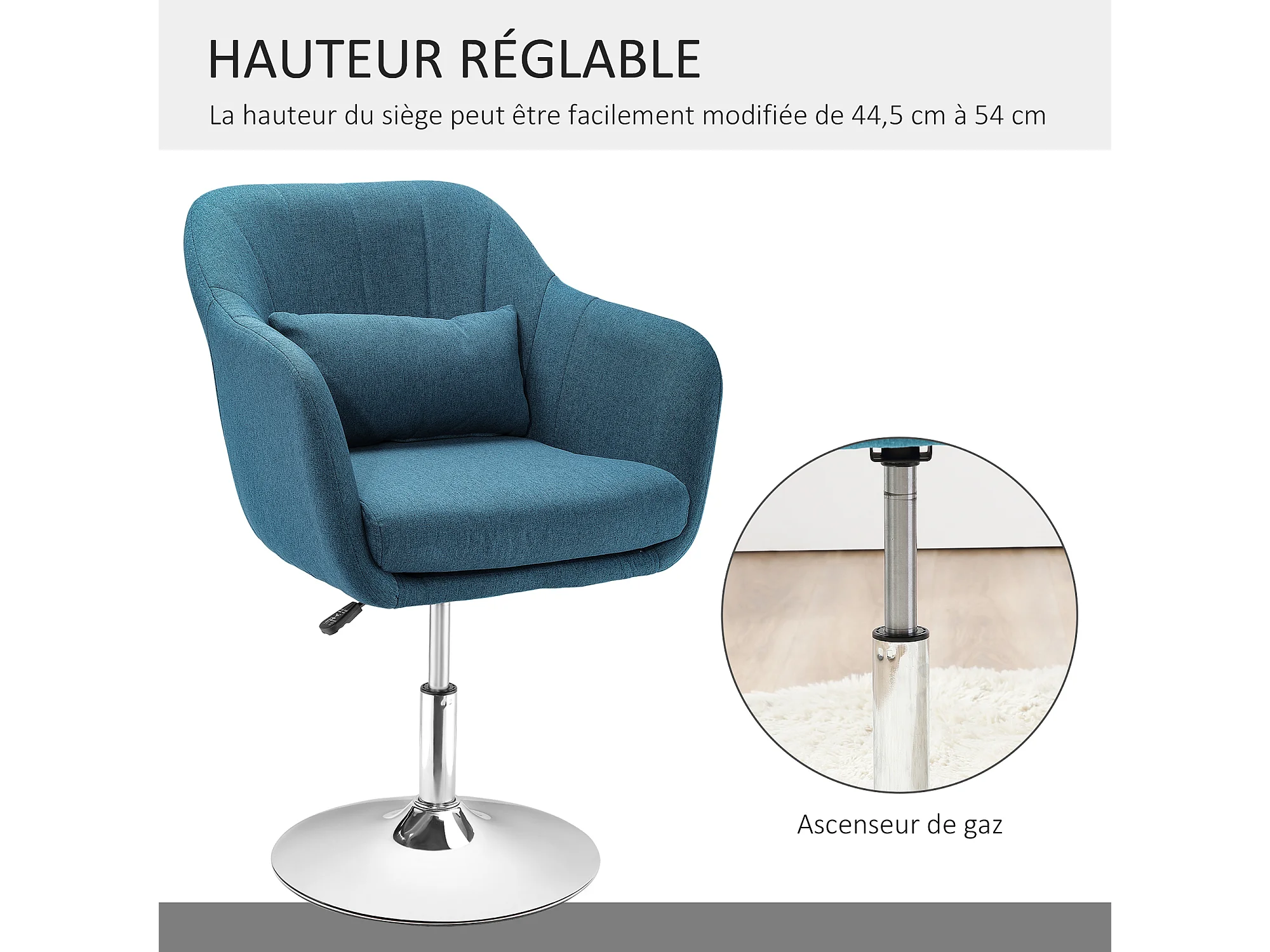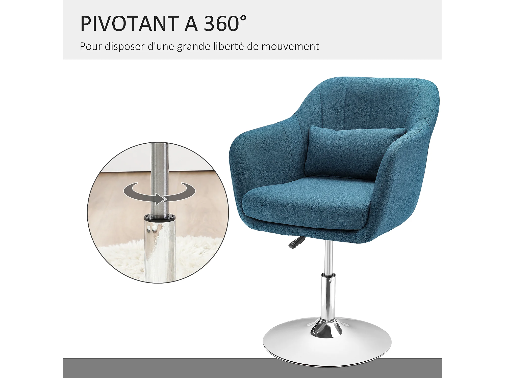 Fauteuil lounge design grand confort coussins lombaires hauteur réglable pivotant 360° piètement métal chromé lin bleu canard
