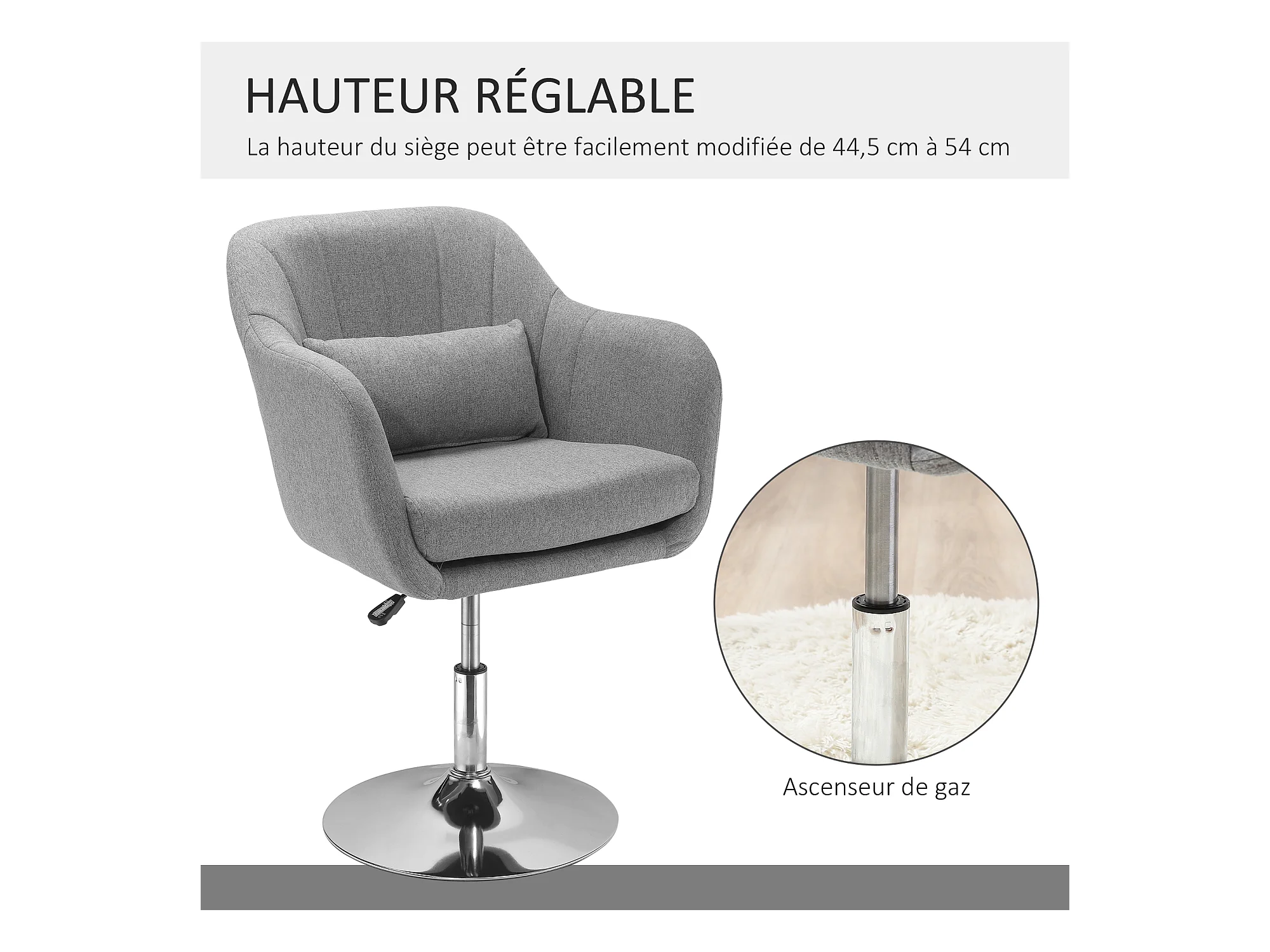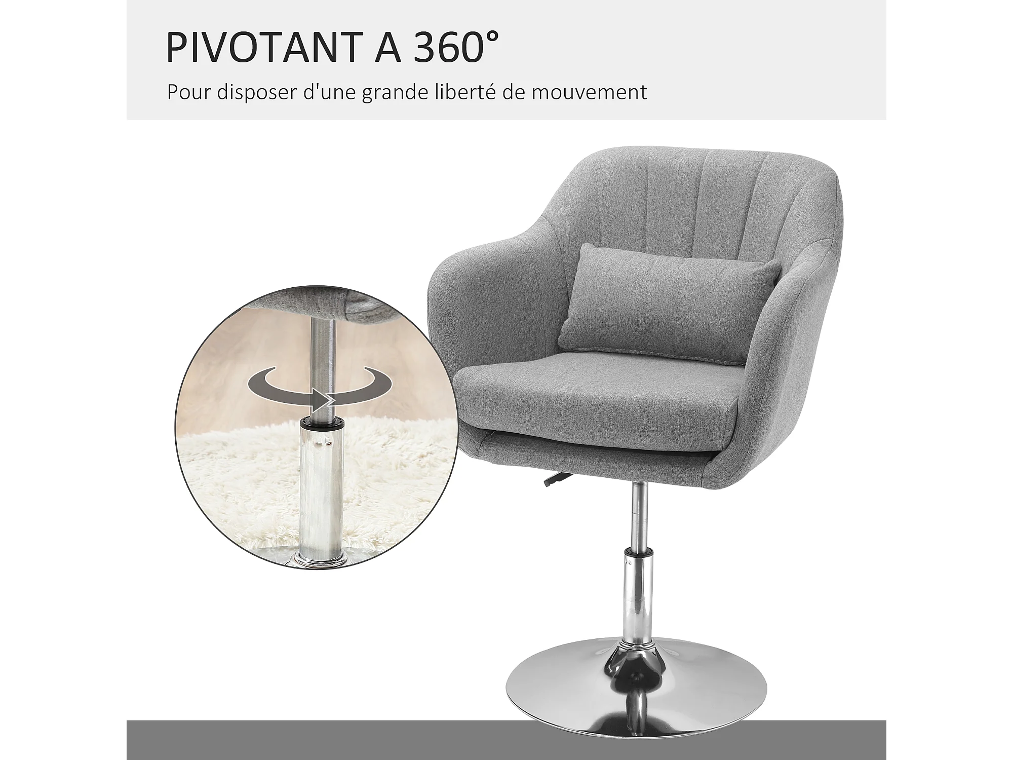 Fauteuil lounge design grand confort coussins lombaires hauteur réglable pivotant 360° piètement métal chromé lin gris