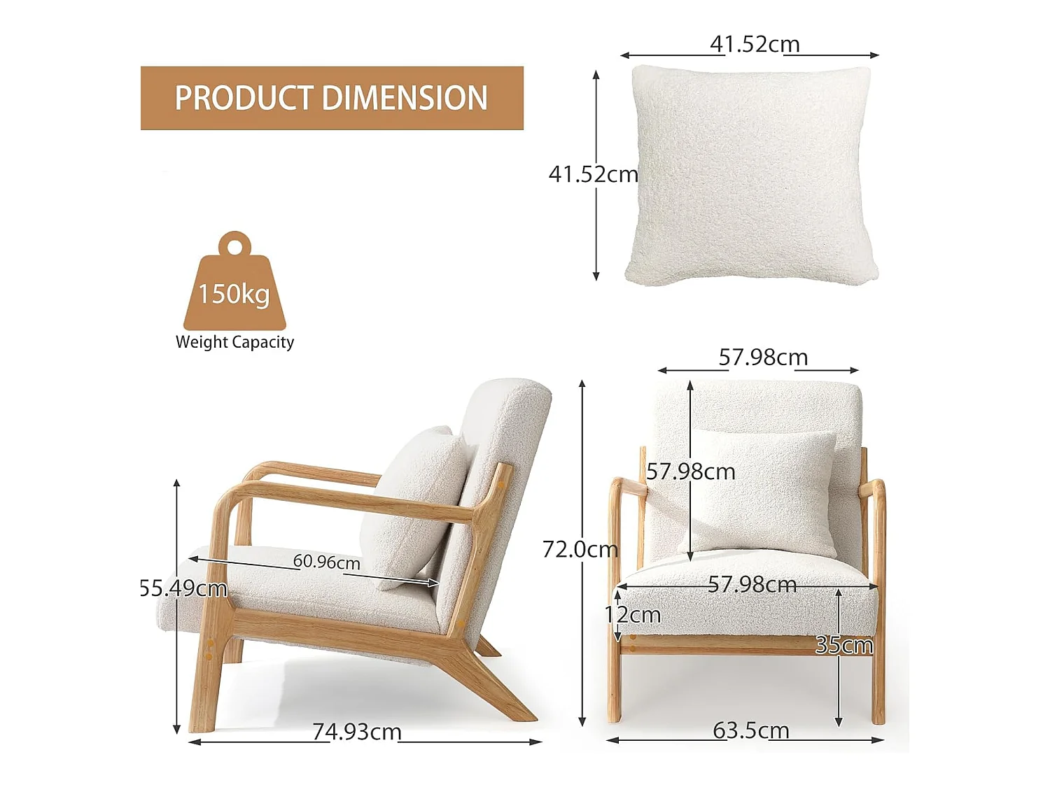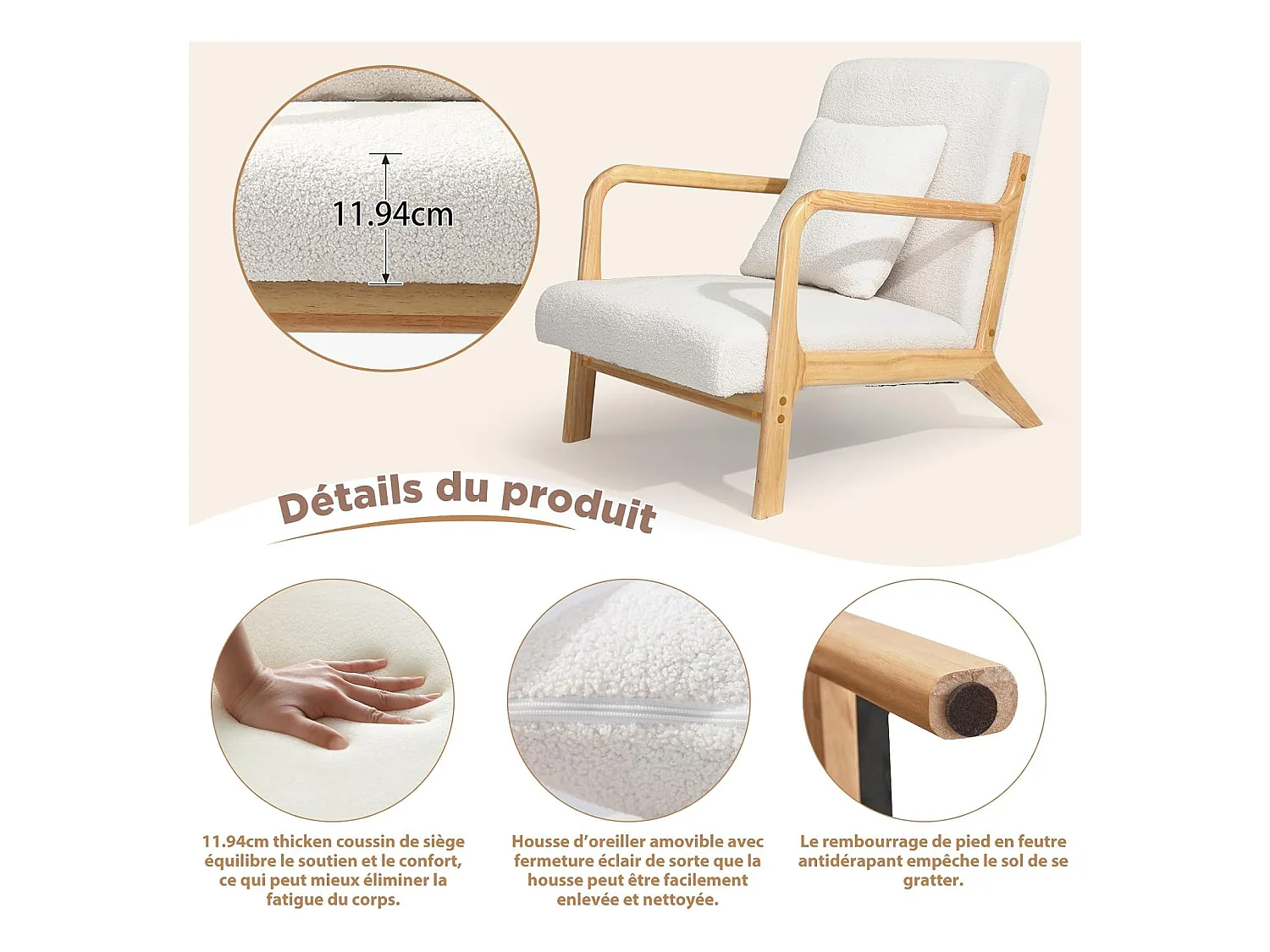 Fauteuil en tissu bouclette avec coussin épais - pieds en bois massif - blanc