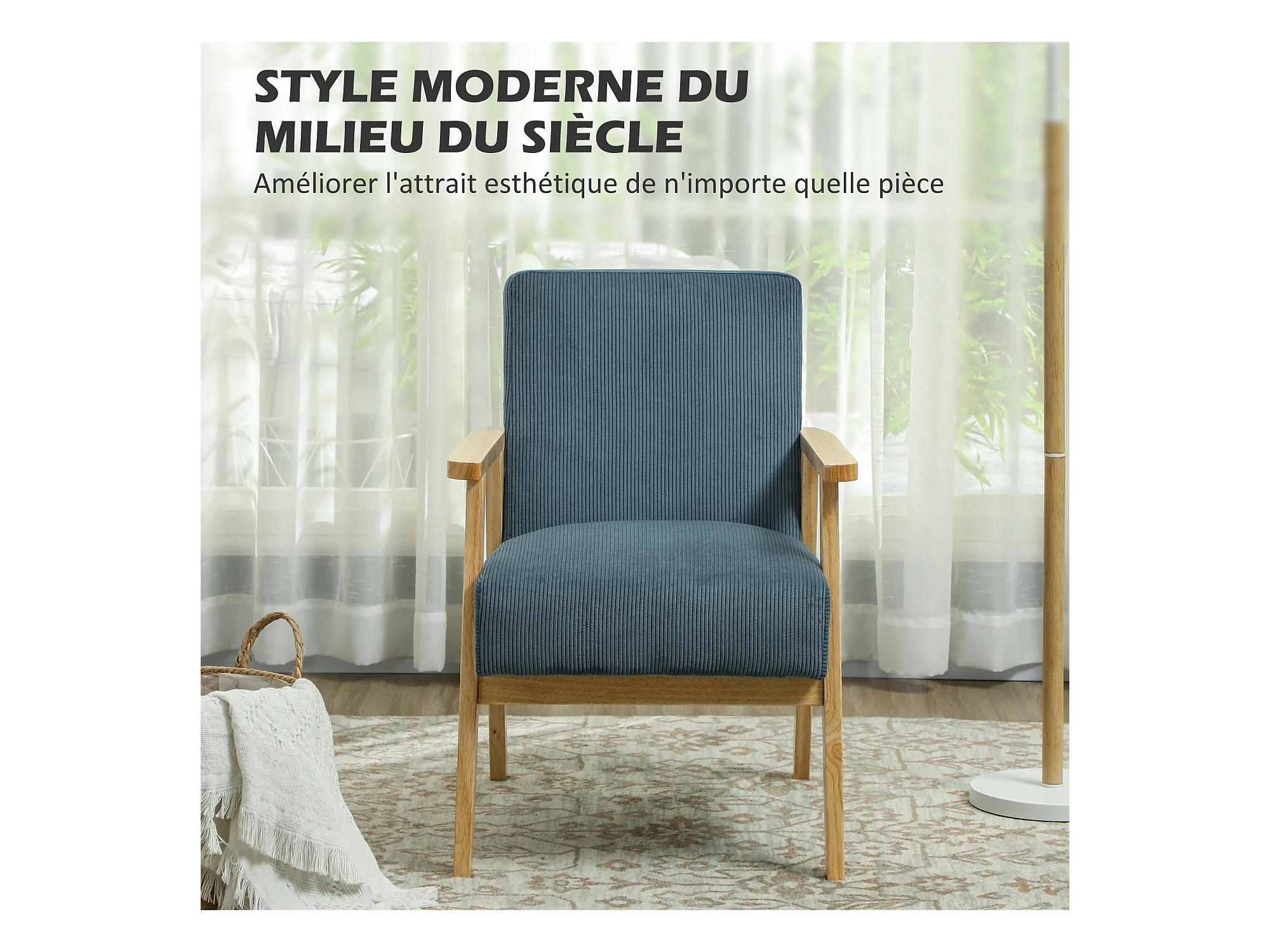 Fauteuil lounge style nordique piètement structure accoudoirs bois hévéa velours côtelé bleu