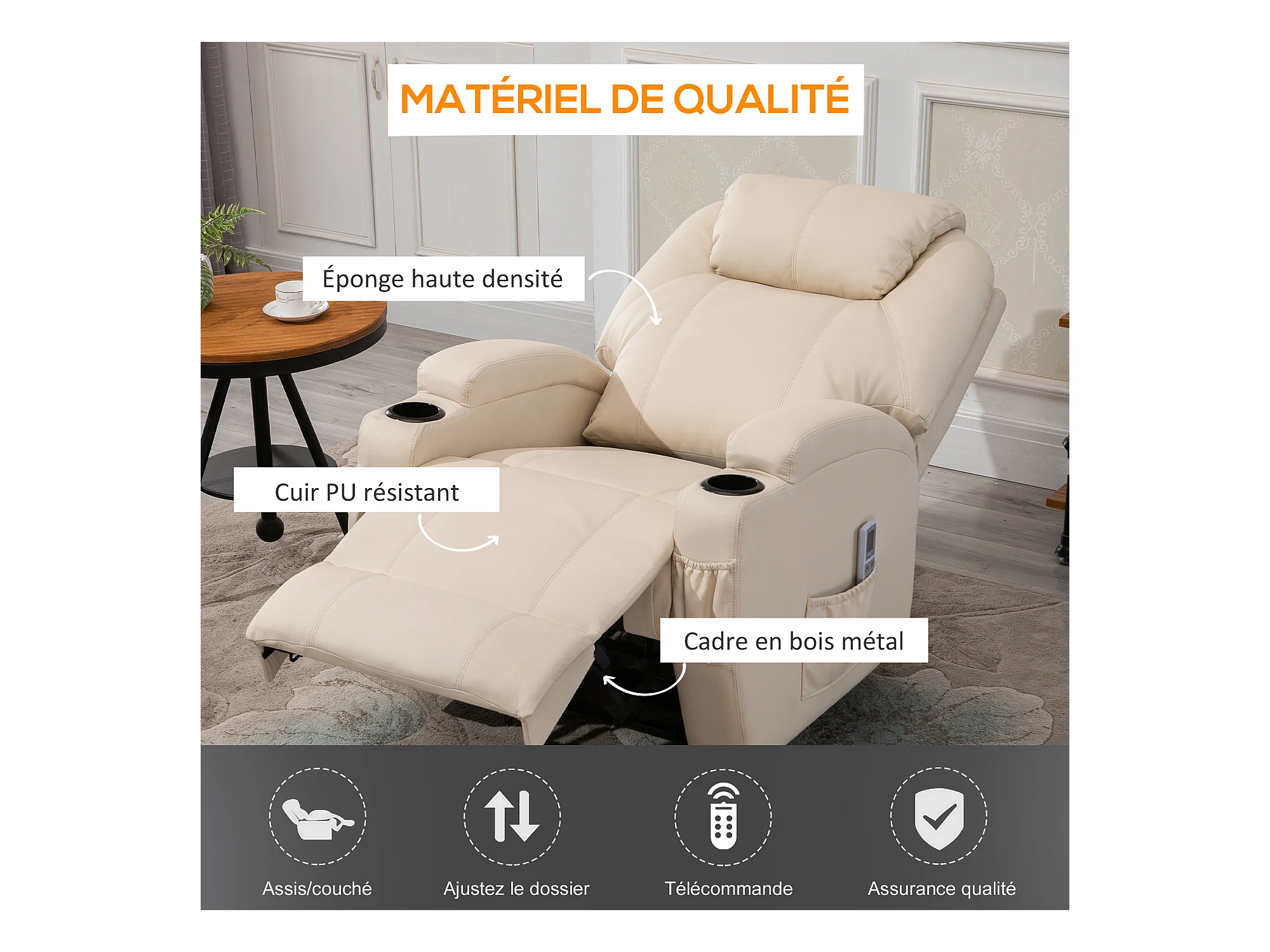 Fauteuil luxe de relaxation et massage inclinaison dossier repose-pied électrique revêtement synthétique crème