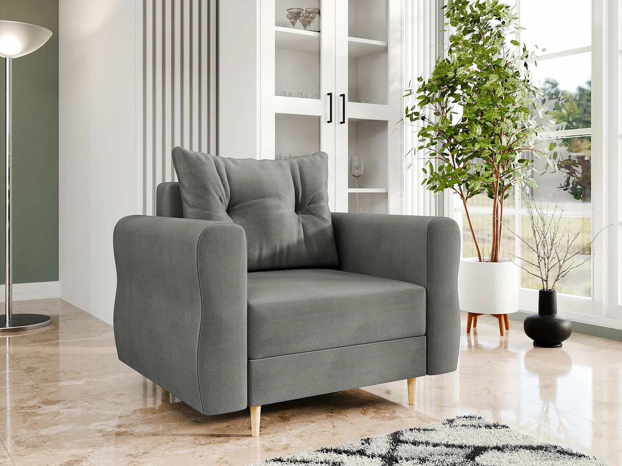 Fauteuil Veldala 104, Gris, 85x106x77cm, Tapisserie, Pieds: Bois