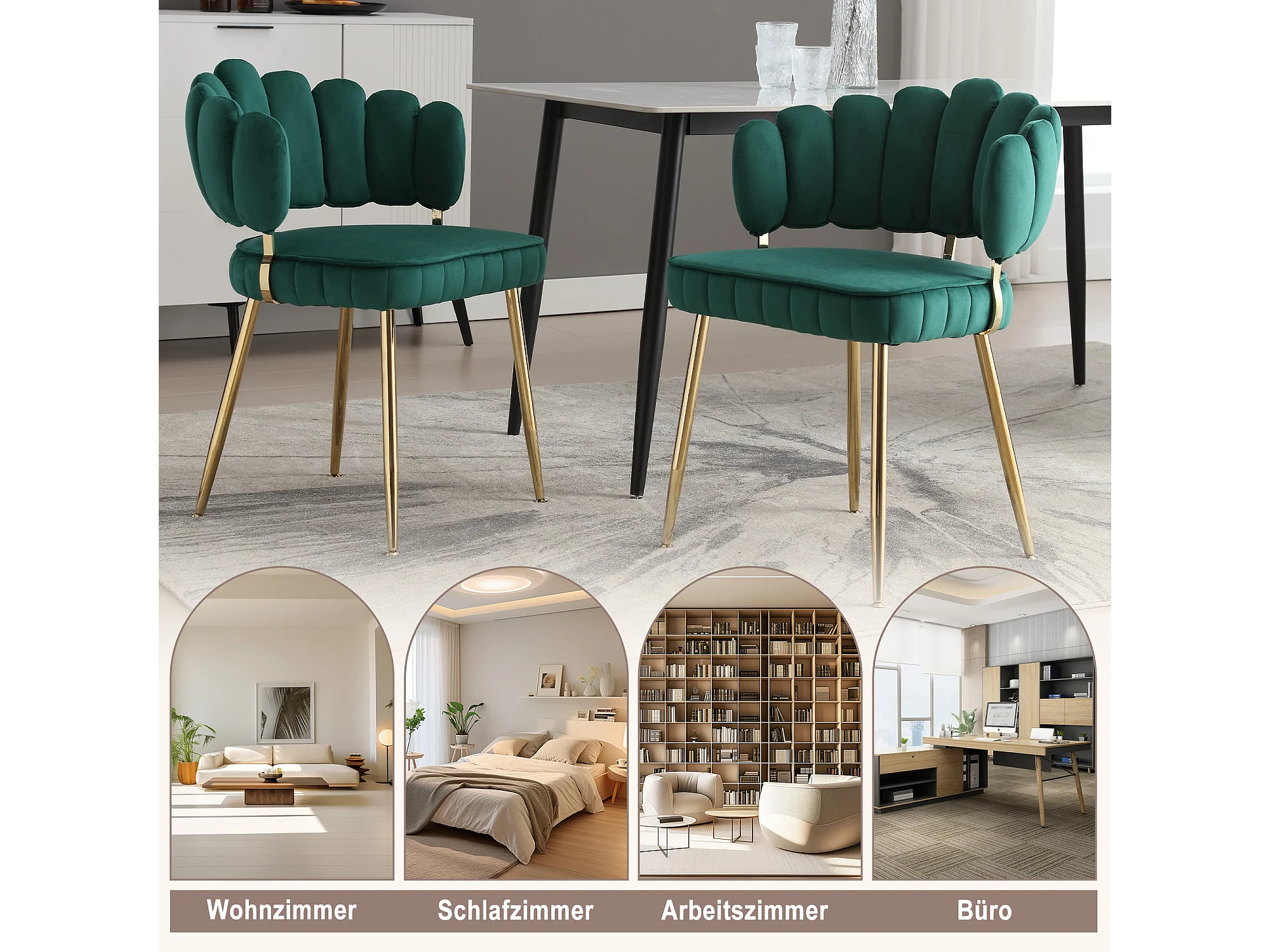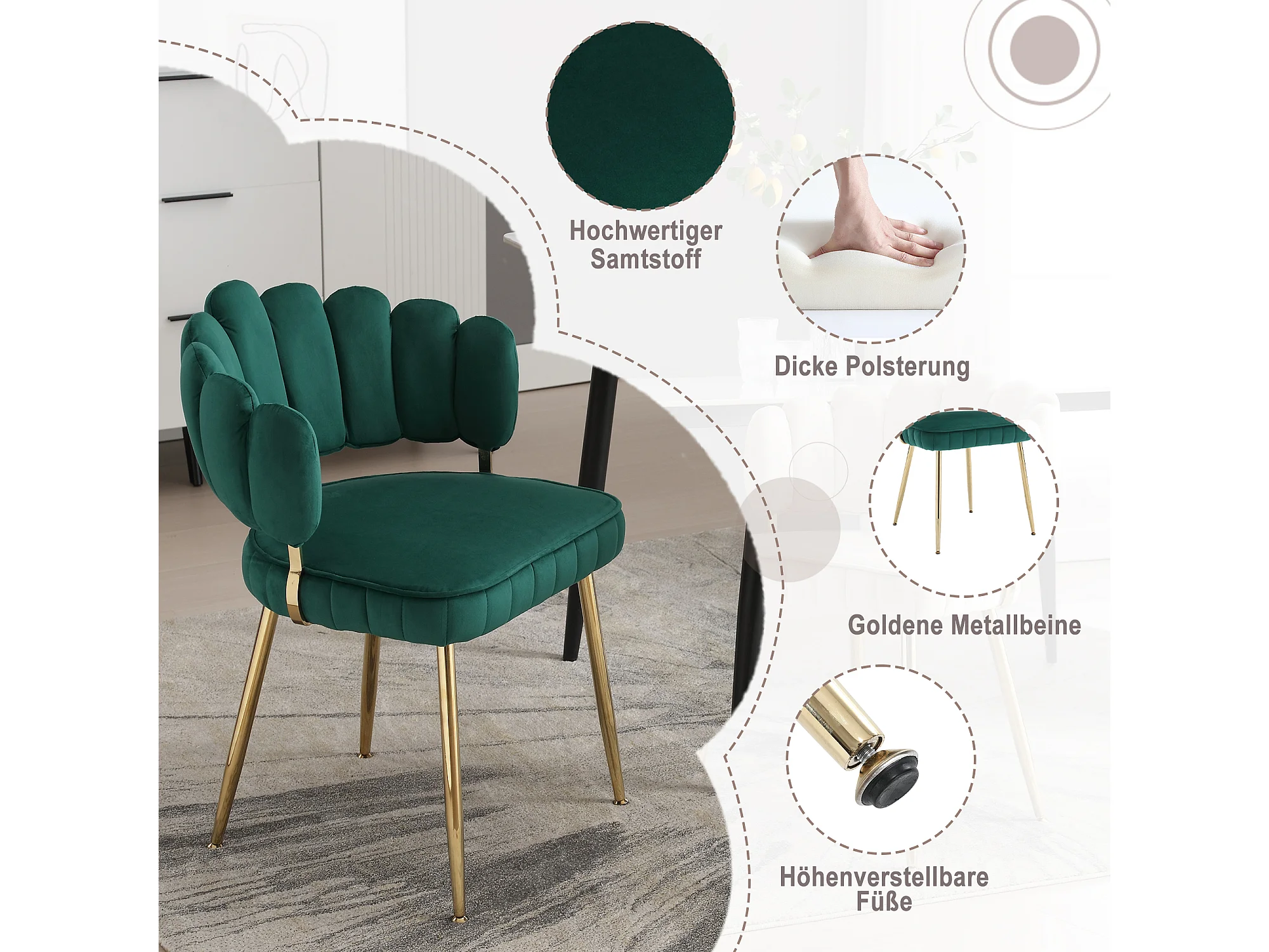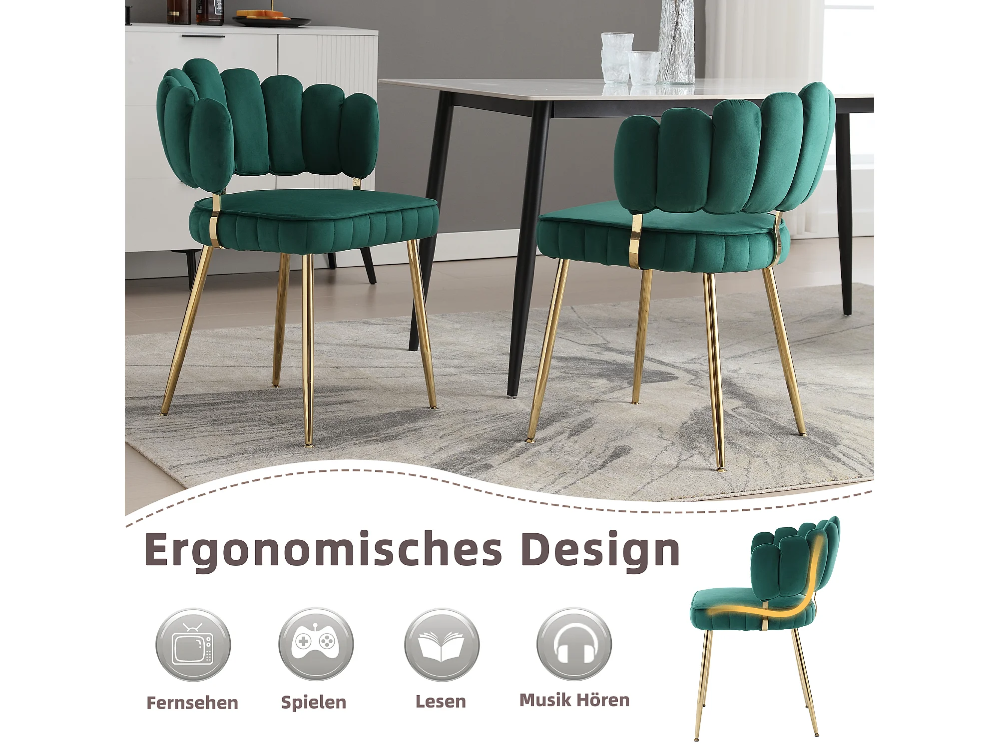 Fauteuil moderne en velours, dossier en forme de fleur, accoudoirs arrondis, pieds en métal, vert émeraude (58x56x78 cm, lot de 2)