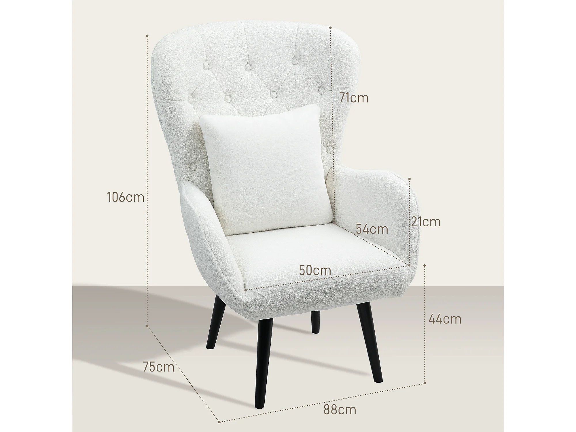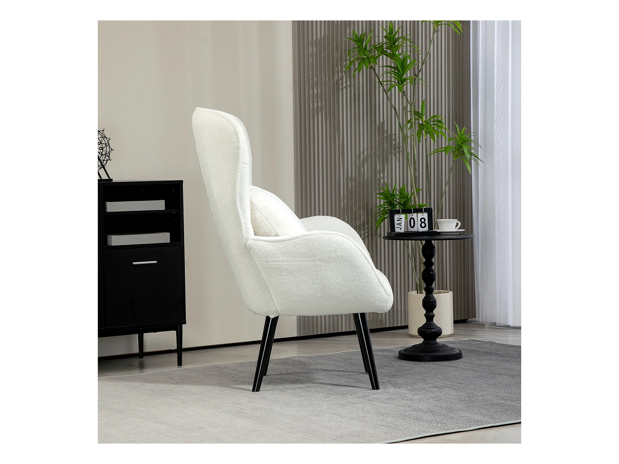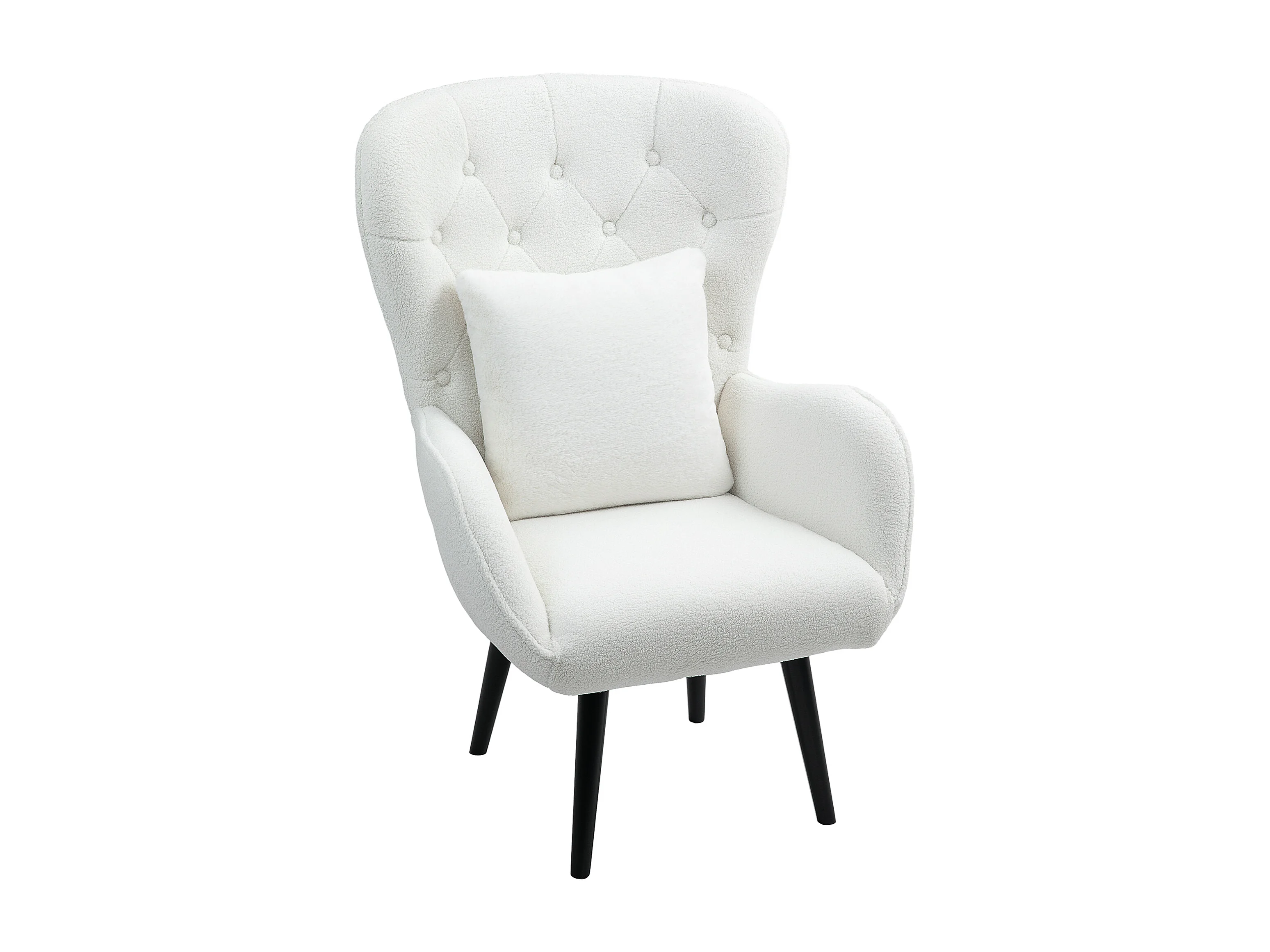 Fauteuil relax, avec coussin lombaire, tissu teddy, pieds en bois, dossier capitonné, blanc (88x75x106 cm)