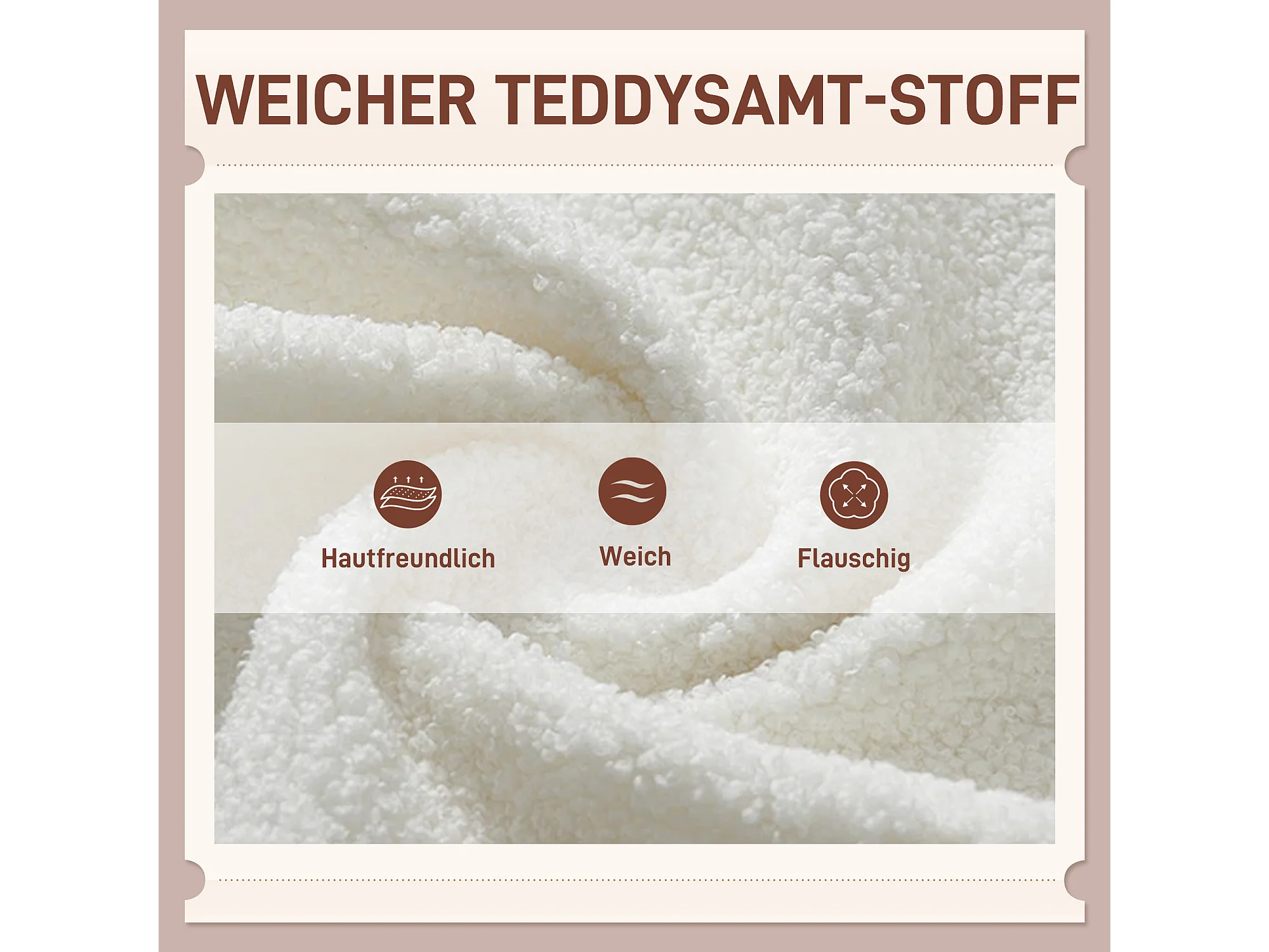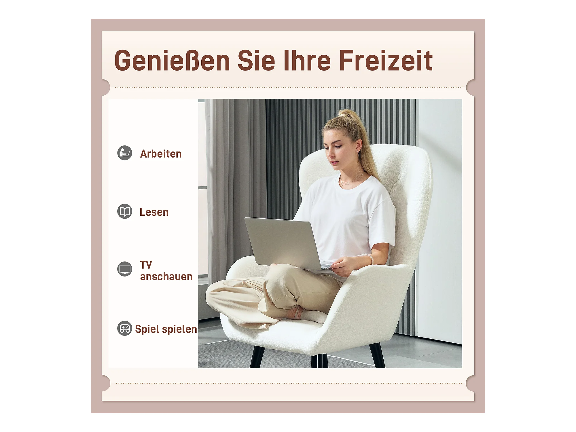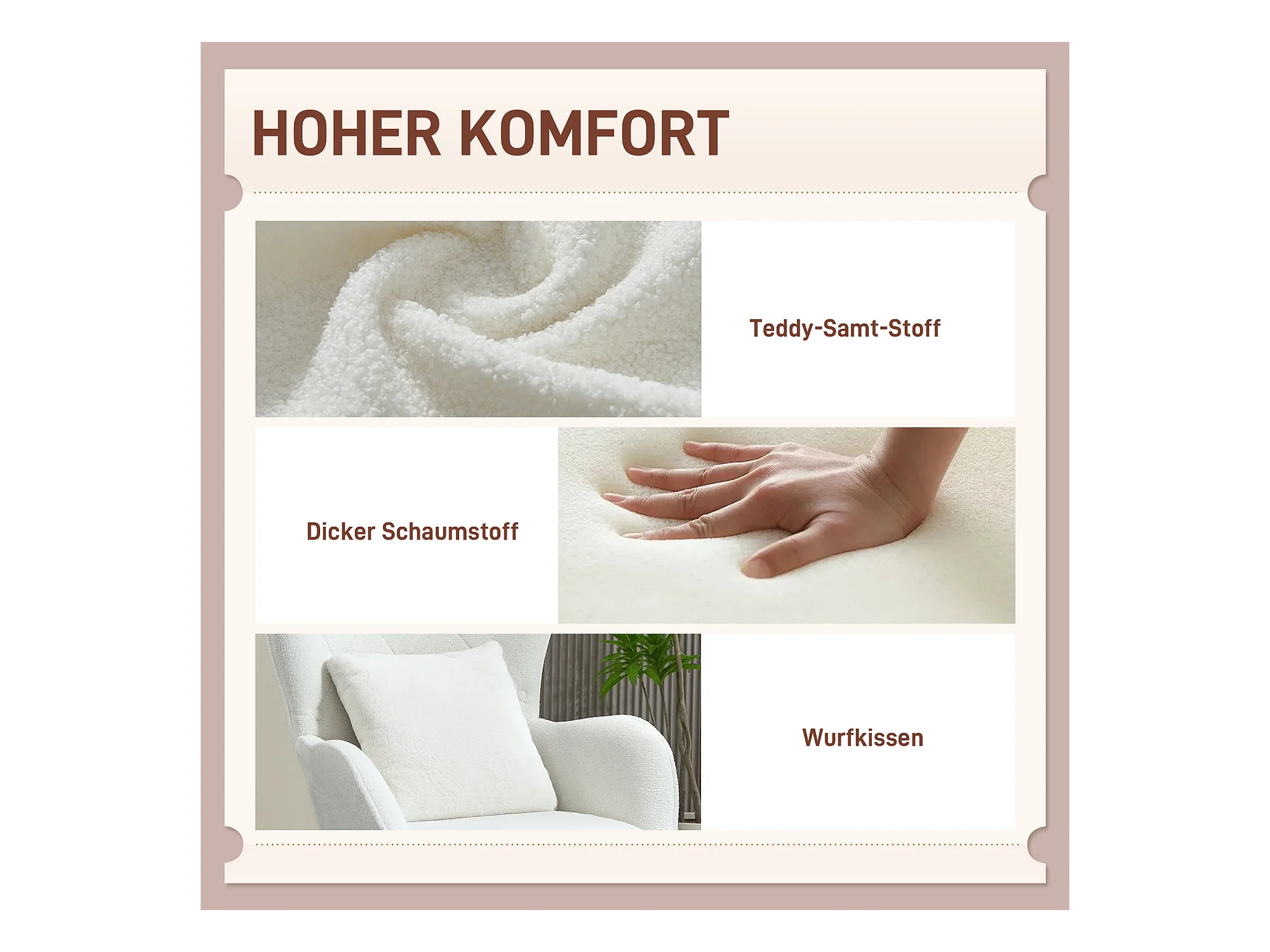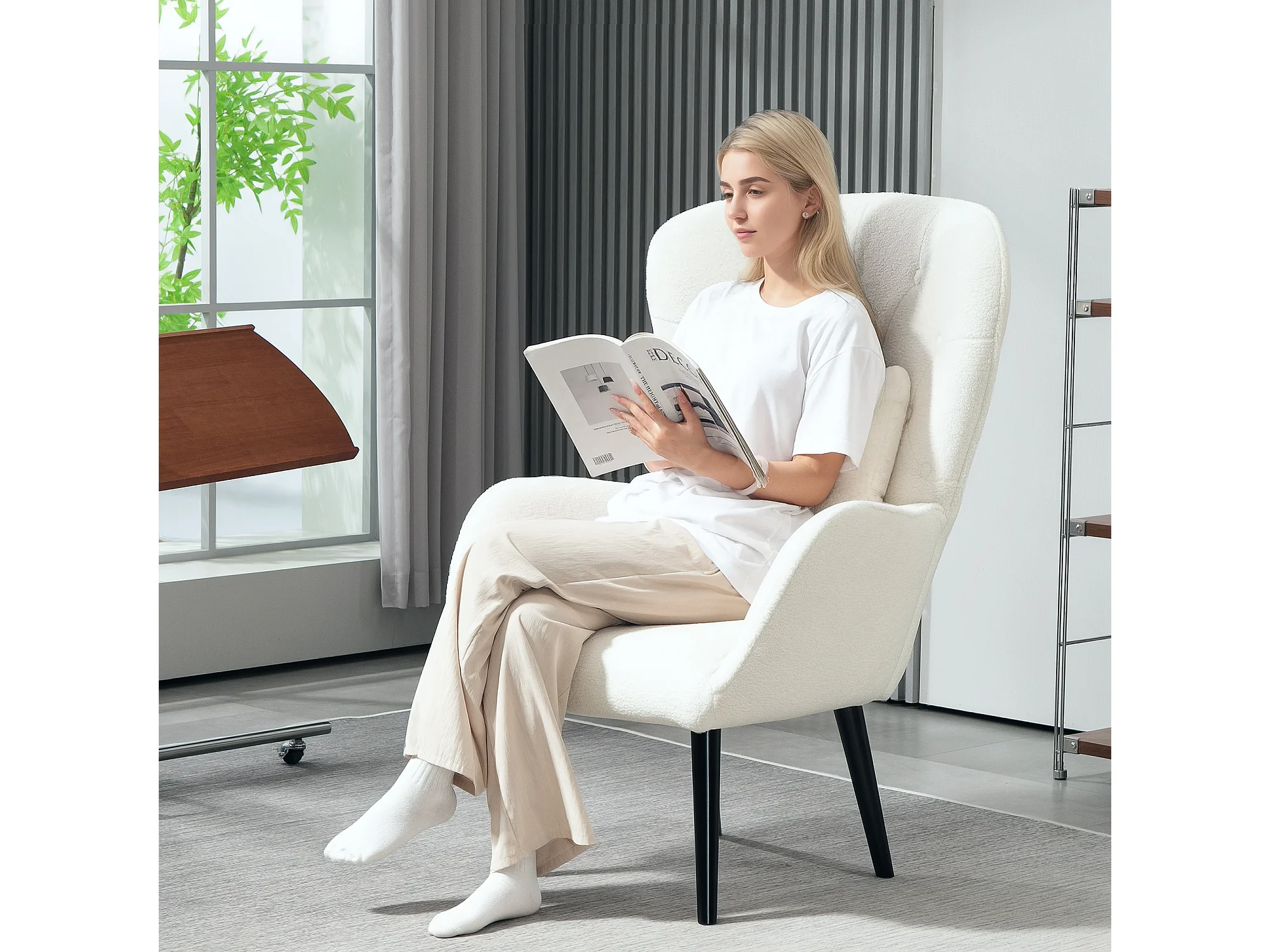Fauteuil relax, avec coussin lombaire, tissu teddy, pieds en bois, dossier capitonné, blanc (88x75x106 cm)