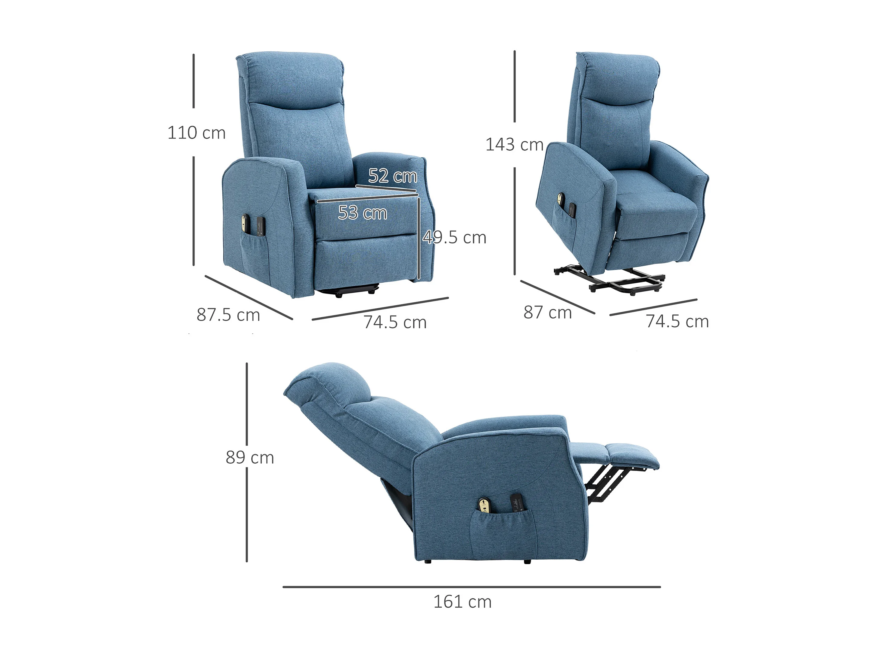 Fauteuil relax avec fonction de levée, massage avec télécommande, tissu lin, bleu (74.5x87.5x110 cm)