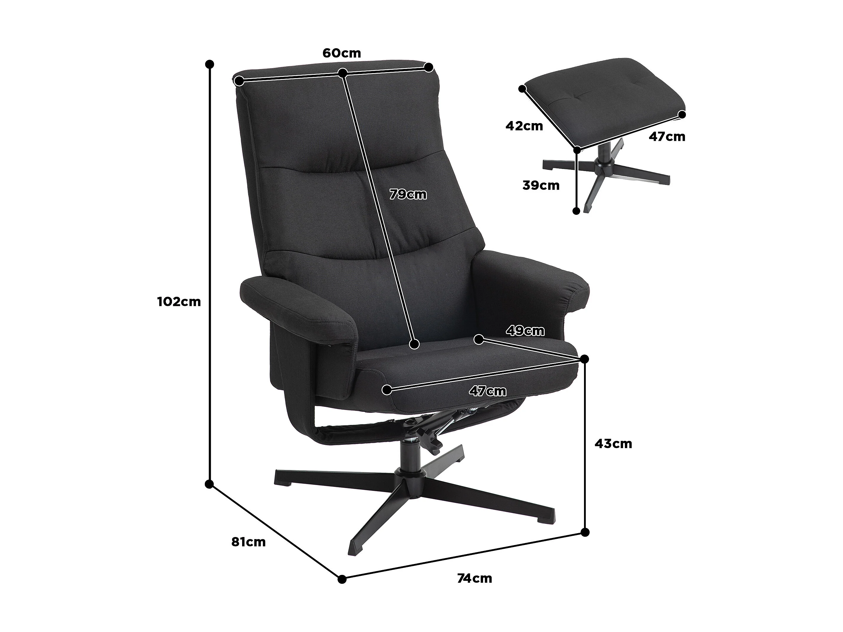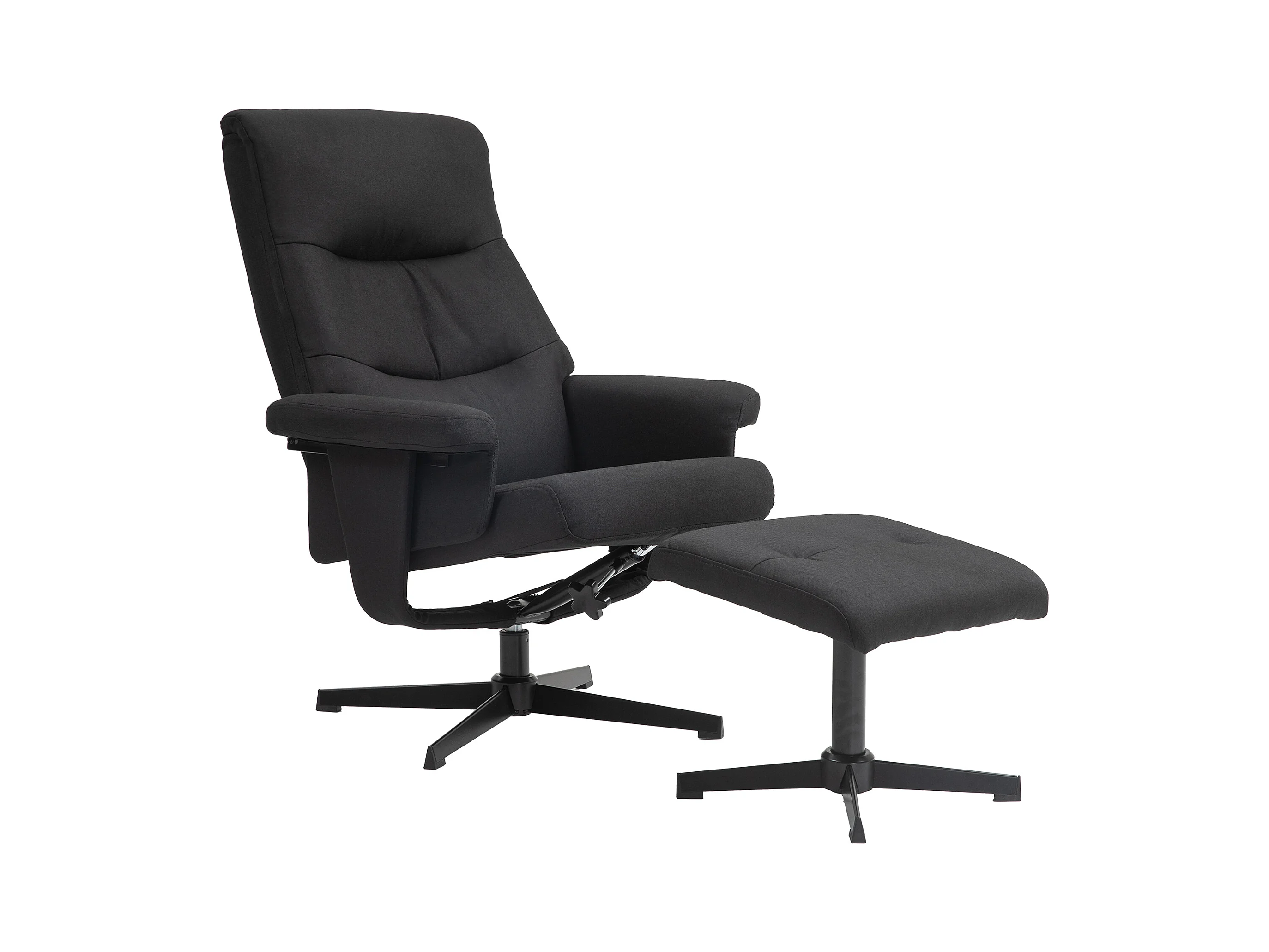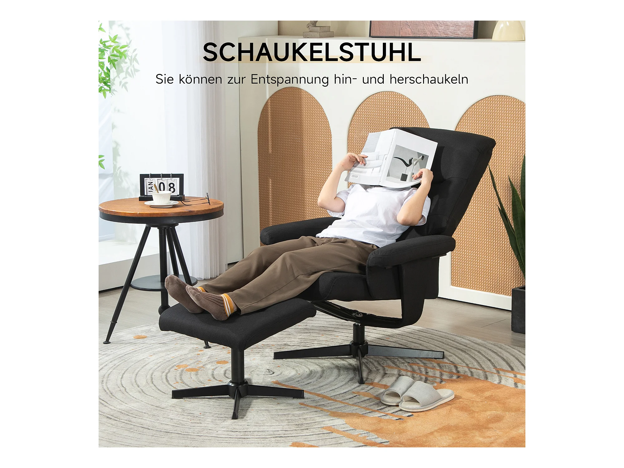 Fauteuil relax avec repose-pieds, inclinable 135°, tissu velours, noir (74x81x102cm)