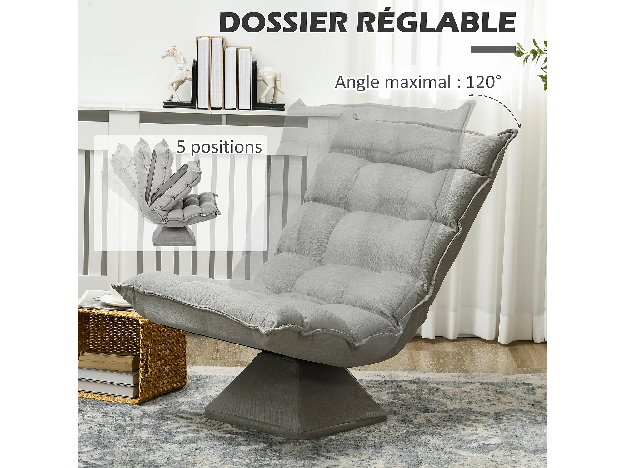 Fauteuil relax grand confort pivotant inclinaison réglable 5 niv. épais garnissage mousse haute densité tissu velours microfibre gris clair