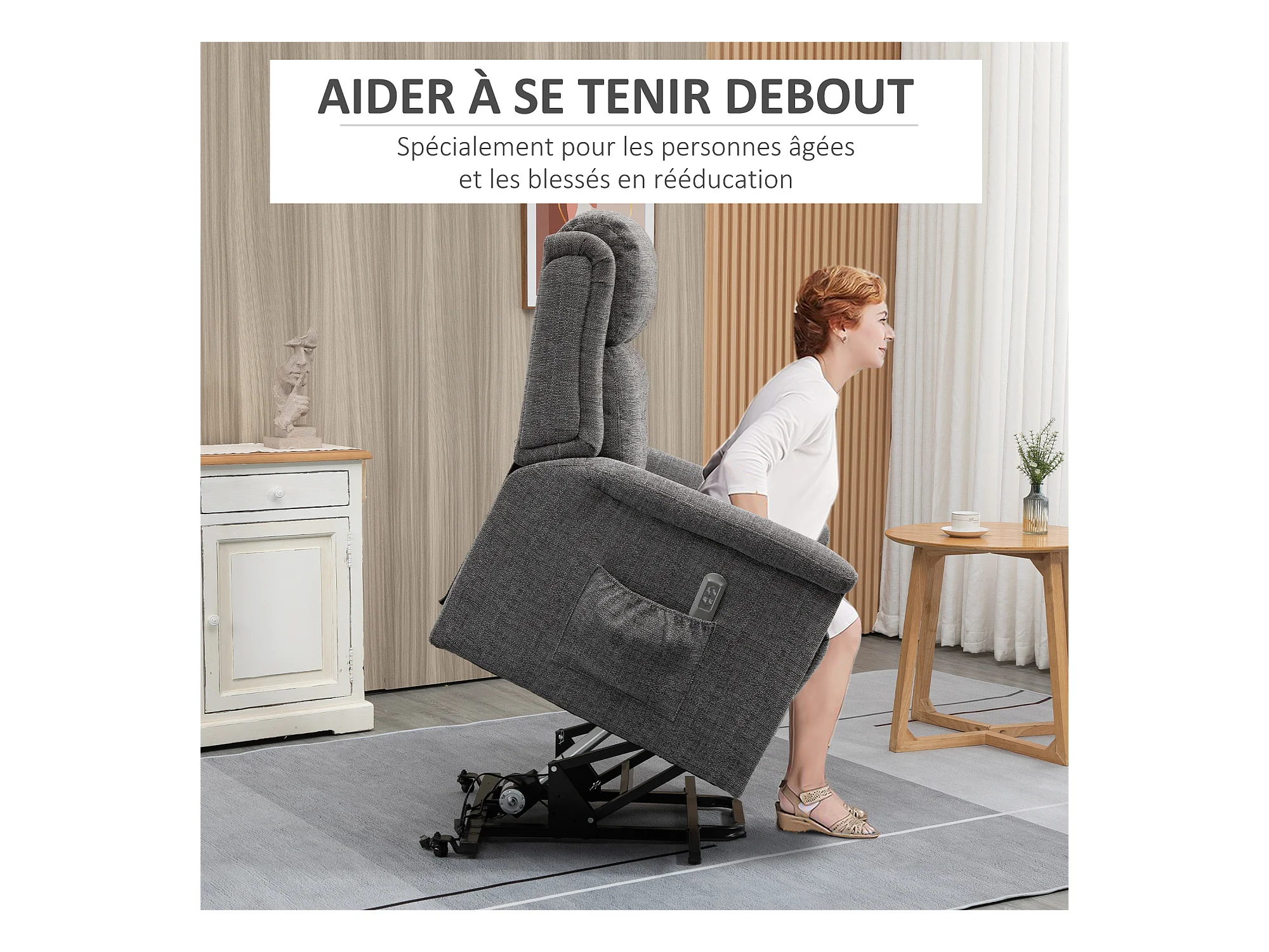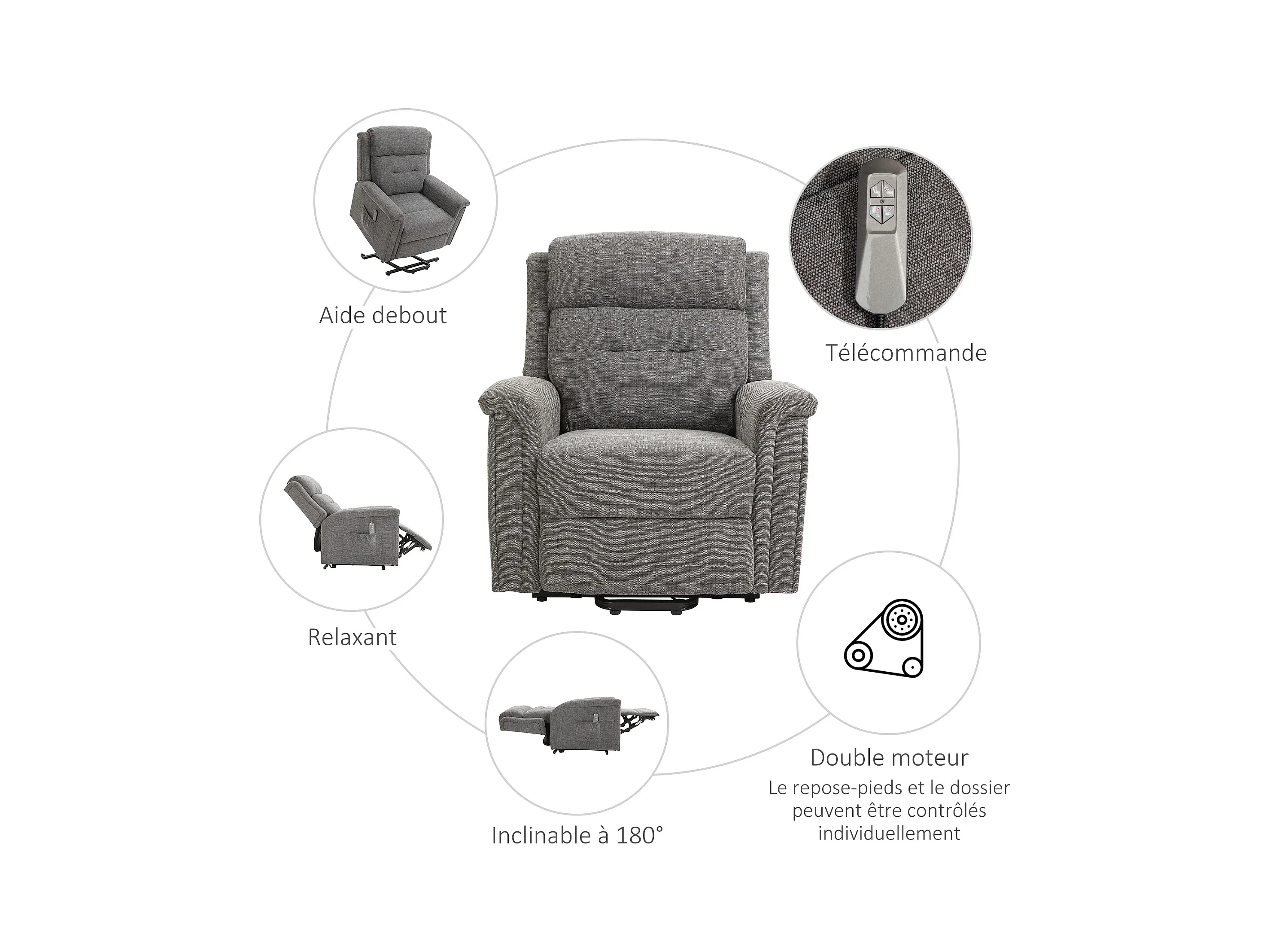 Fauteuil releveur électrique inclinable - repose-pied ajustable - télécommande - Fauteuil de relaxation - tissu polyester aspect lin gris chiné
