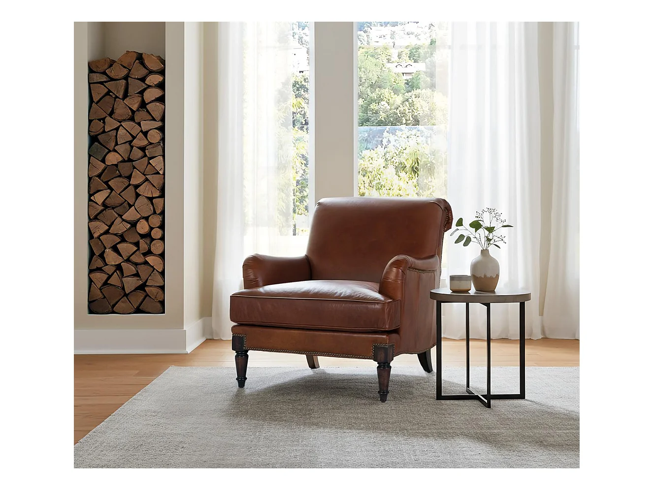 Fauteuil rembourré en cuir avec accoudoirs et pieds en bois