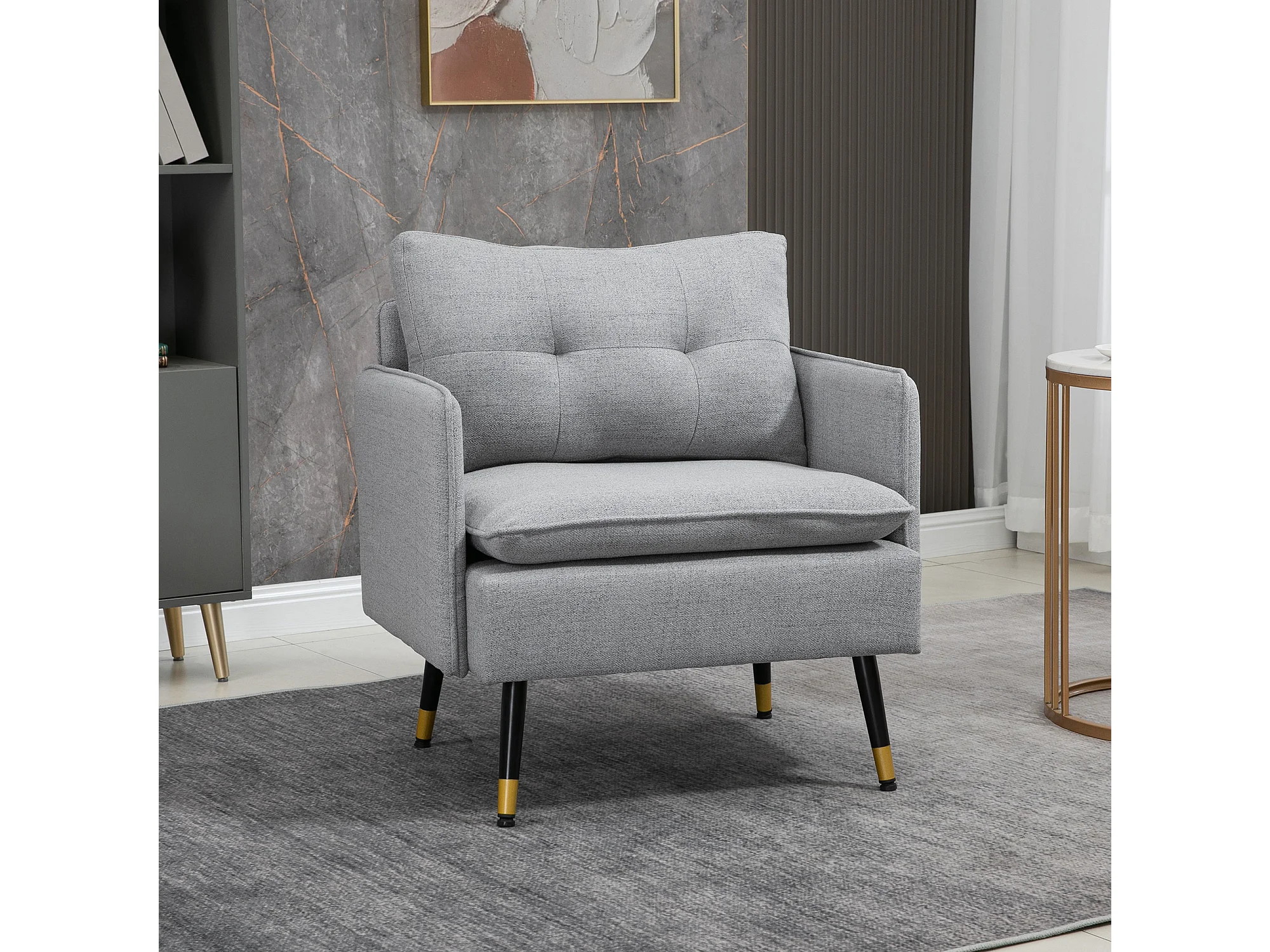 Fauteuil style art-déco dossier effet capitonné piètement incliné effilé métal noir extrémités dorées tissu gris