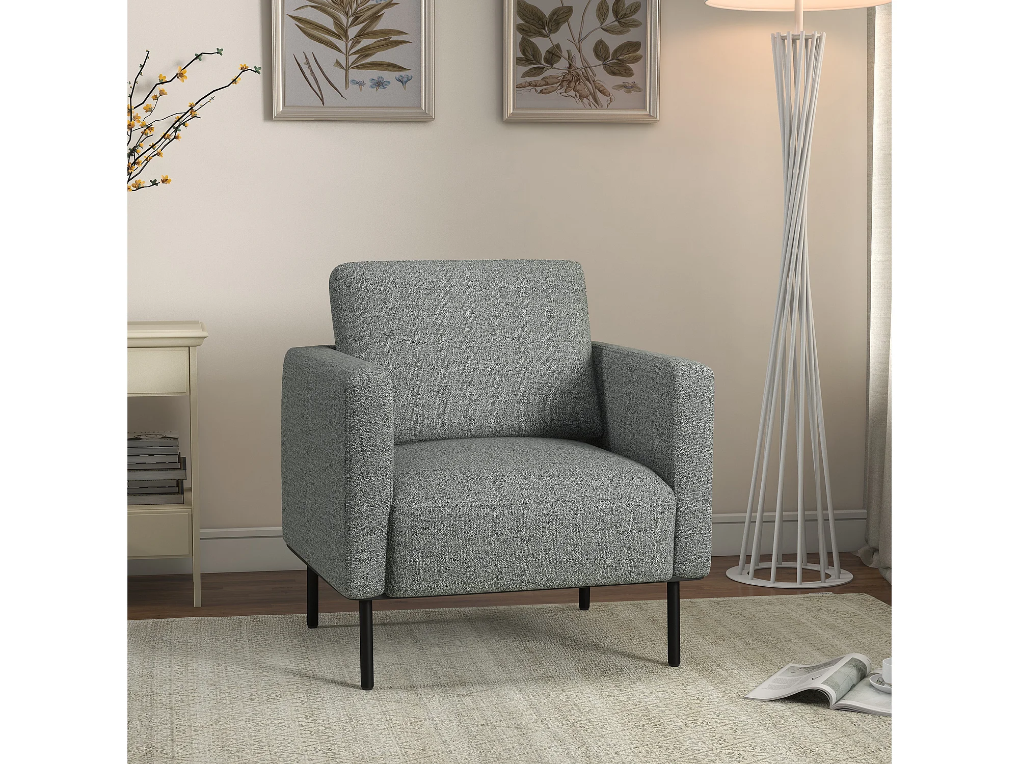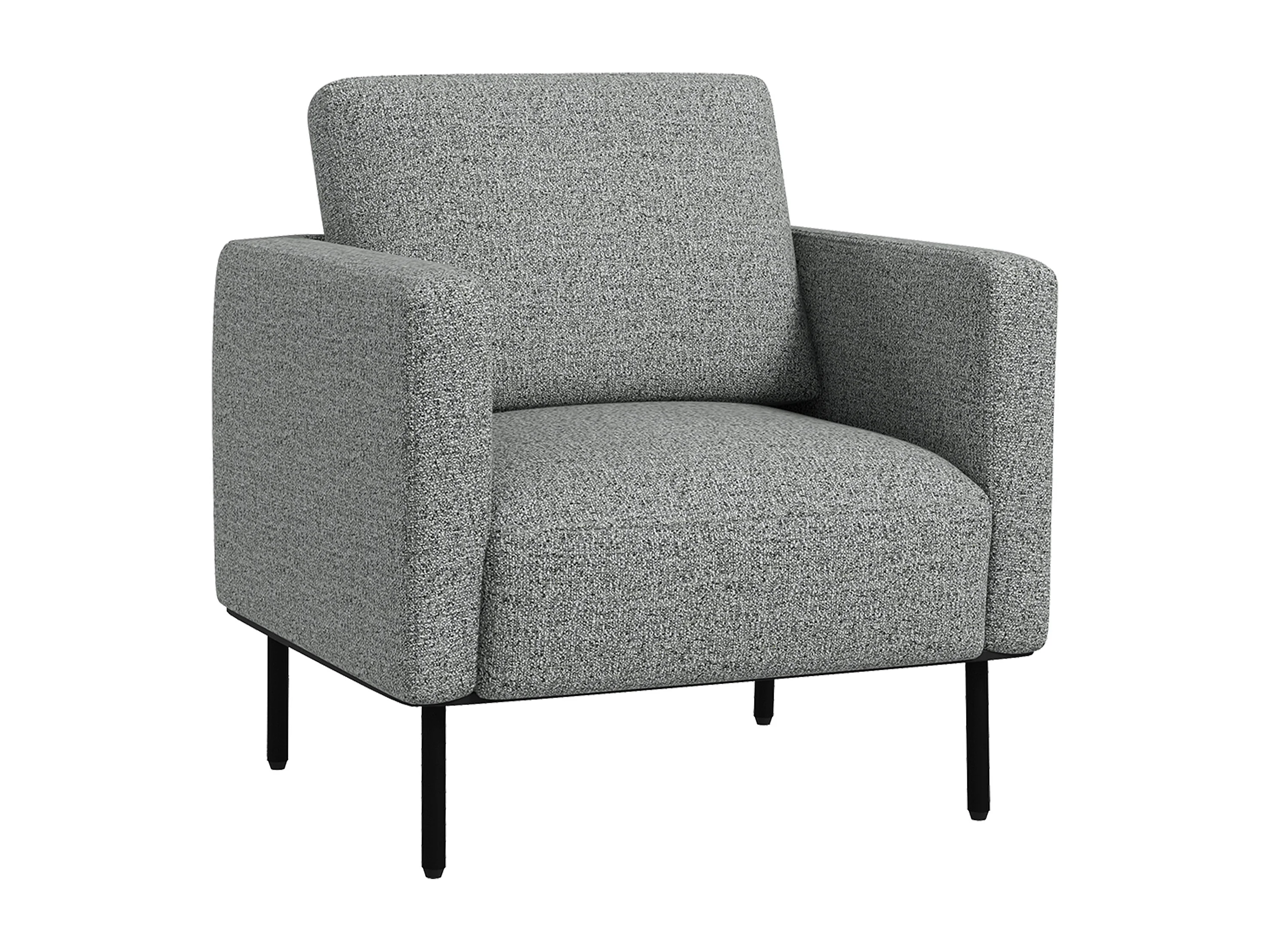 Fauteuil style contemporain grand confort piètement métal noir tissu toucher lin gris chiné