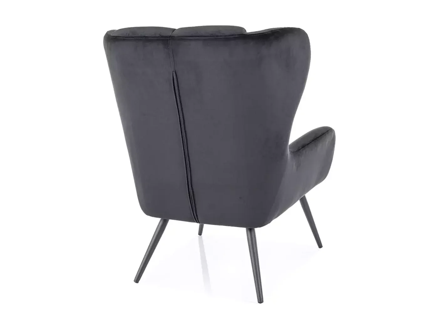 Fauteuil velours noir dossier capitonné style lounge pieds métal noir SUITE