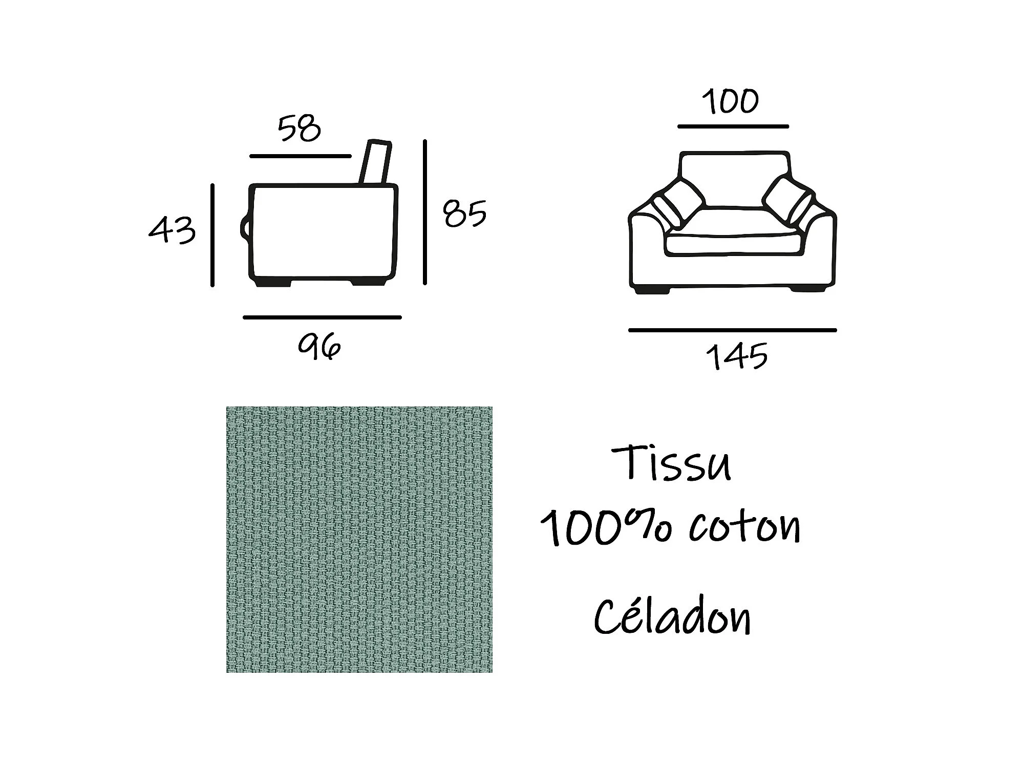 Fauteuil XL TRESSIN 145 cm fixe tissu coton Céladon - 100% déhoussable - Fab. France
