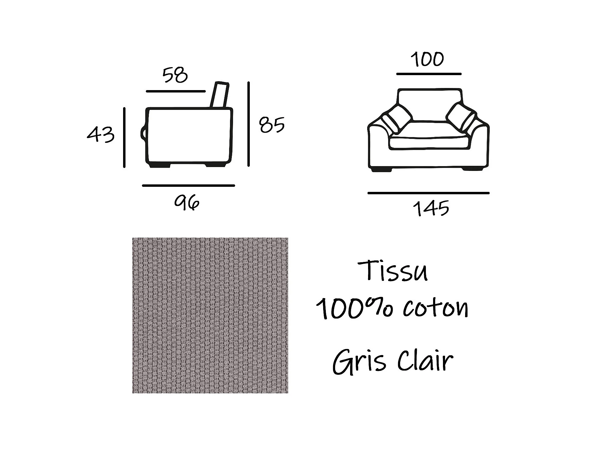 Fauteuil XL TRESSIN 145 cm fixe tissu coton Gris Clair - 100% déhoussable - Fab. France