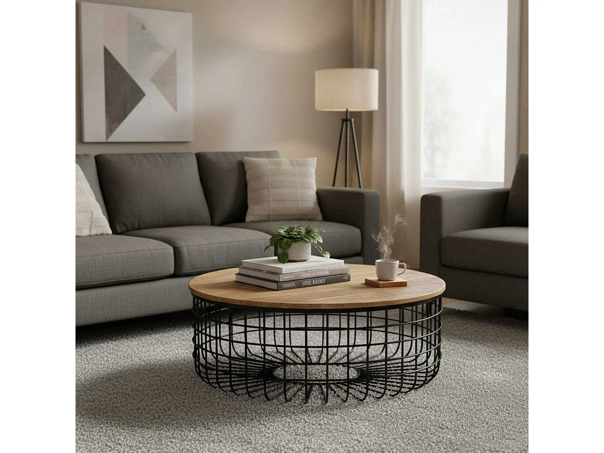 GLADIO - Table Basse Ronde Ø102cm Industrielle Bois d'Acacia et Métal Noir