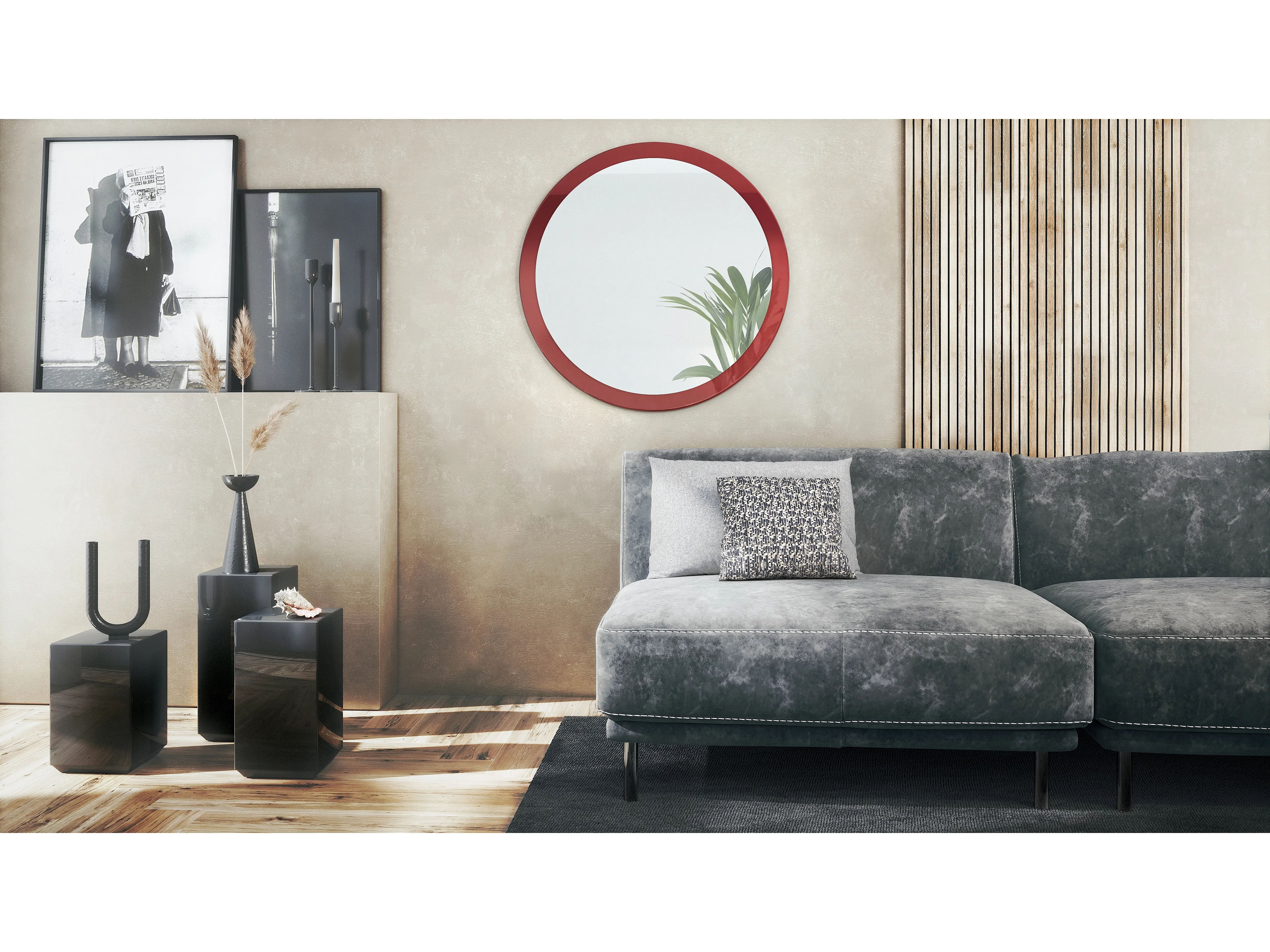 Miroir Globe 50 cm, lot de 3, miroirs muraux ronds décoratifs pour l'entrée et le salon avec cadre en MDF bordeaux haute brillance
