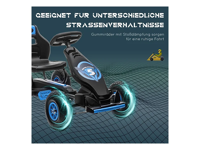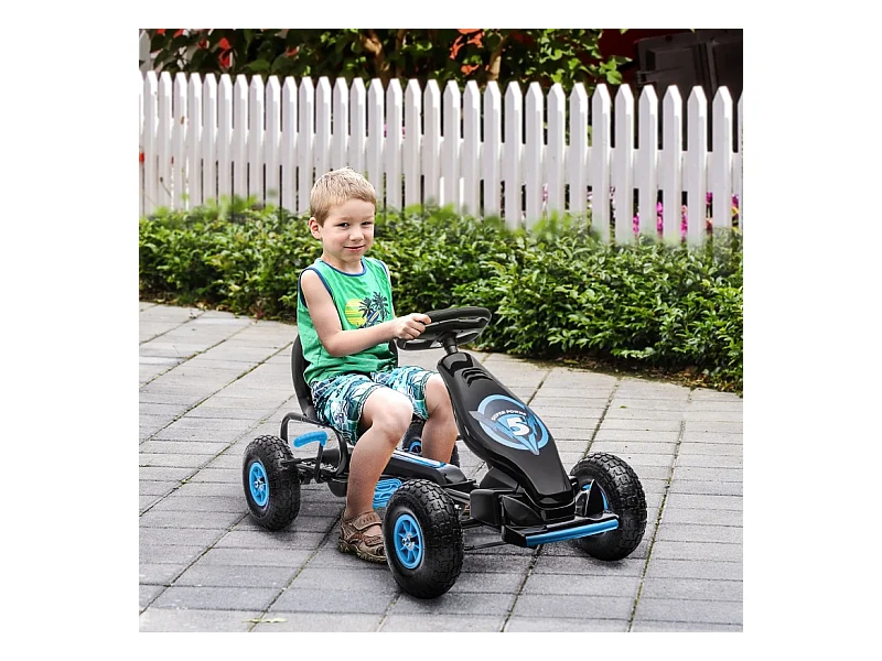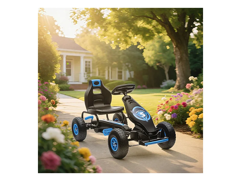 Go-kart enfant avec pédales, siège réglable, intérieur et extérieur, plastique, bleu et noir (121x58x61 cm)