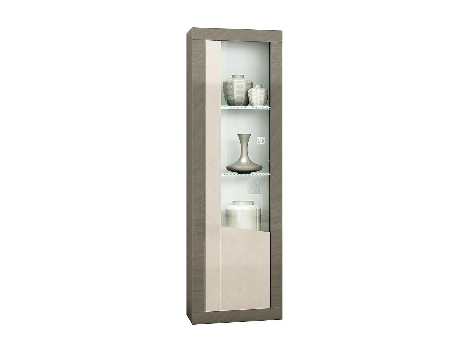 GONDOR - Vitrine 1 Porte Droite Décor Bois Gris Veiné et Beige avec Leds