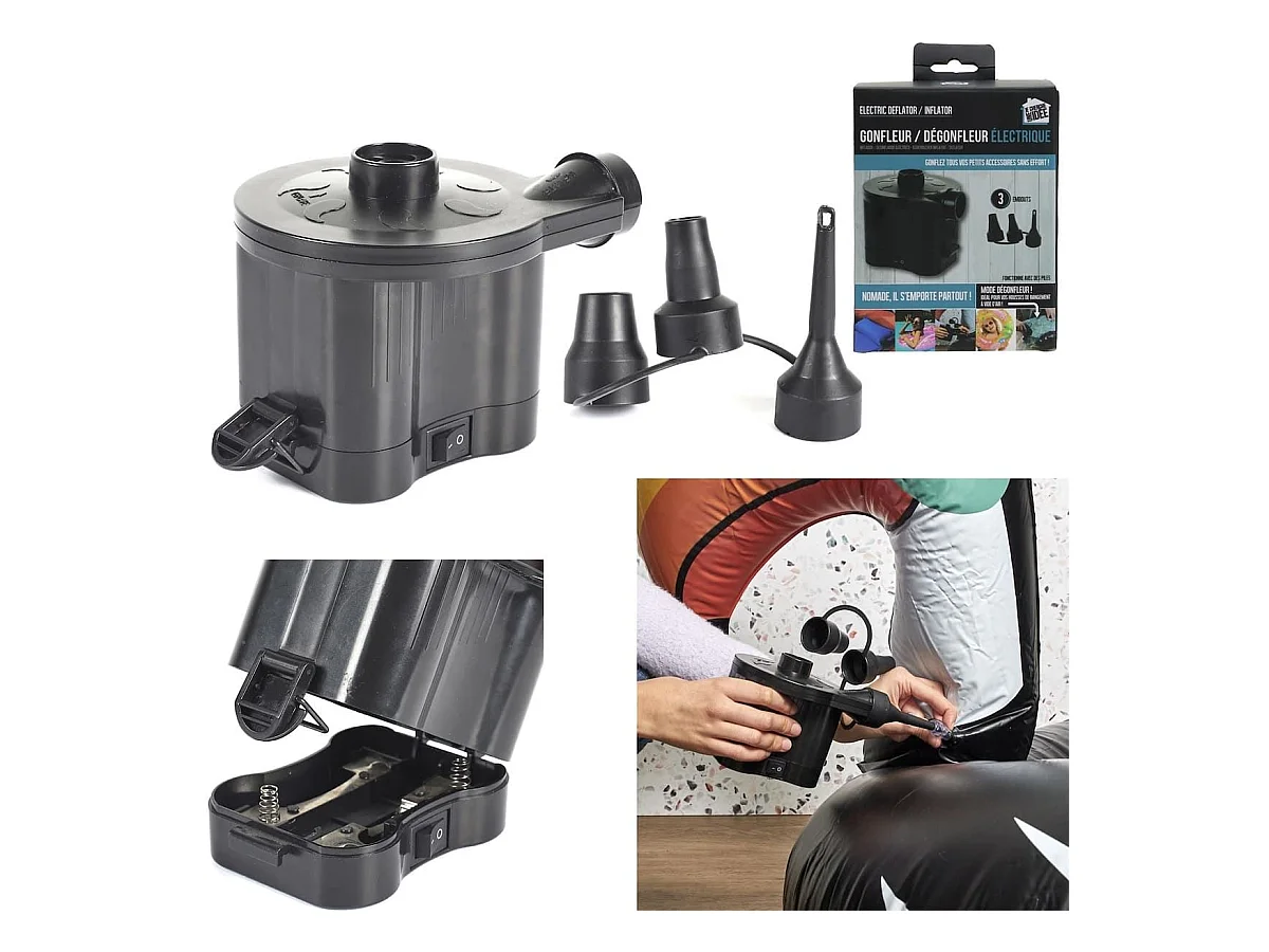 Gonfleur et dégonfleur électriques à piles avec 3 embouts en plastique noir - GONFLEX