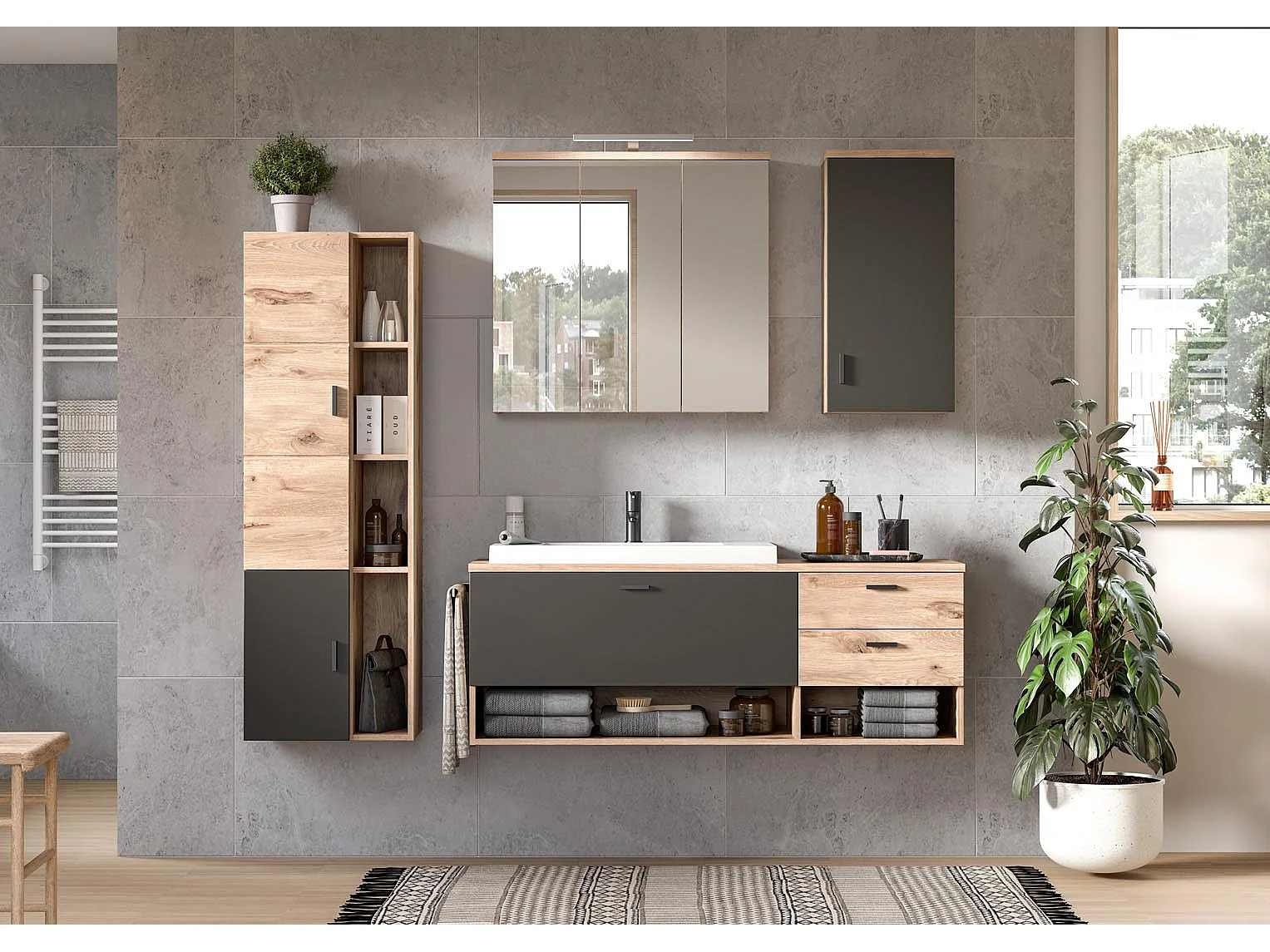 Grado armoire de salle de bain 2 portes, 4 tablettes chêne décor,mat gris.