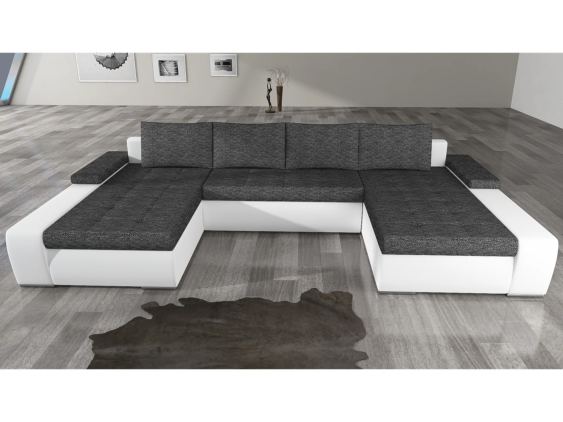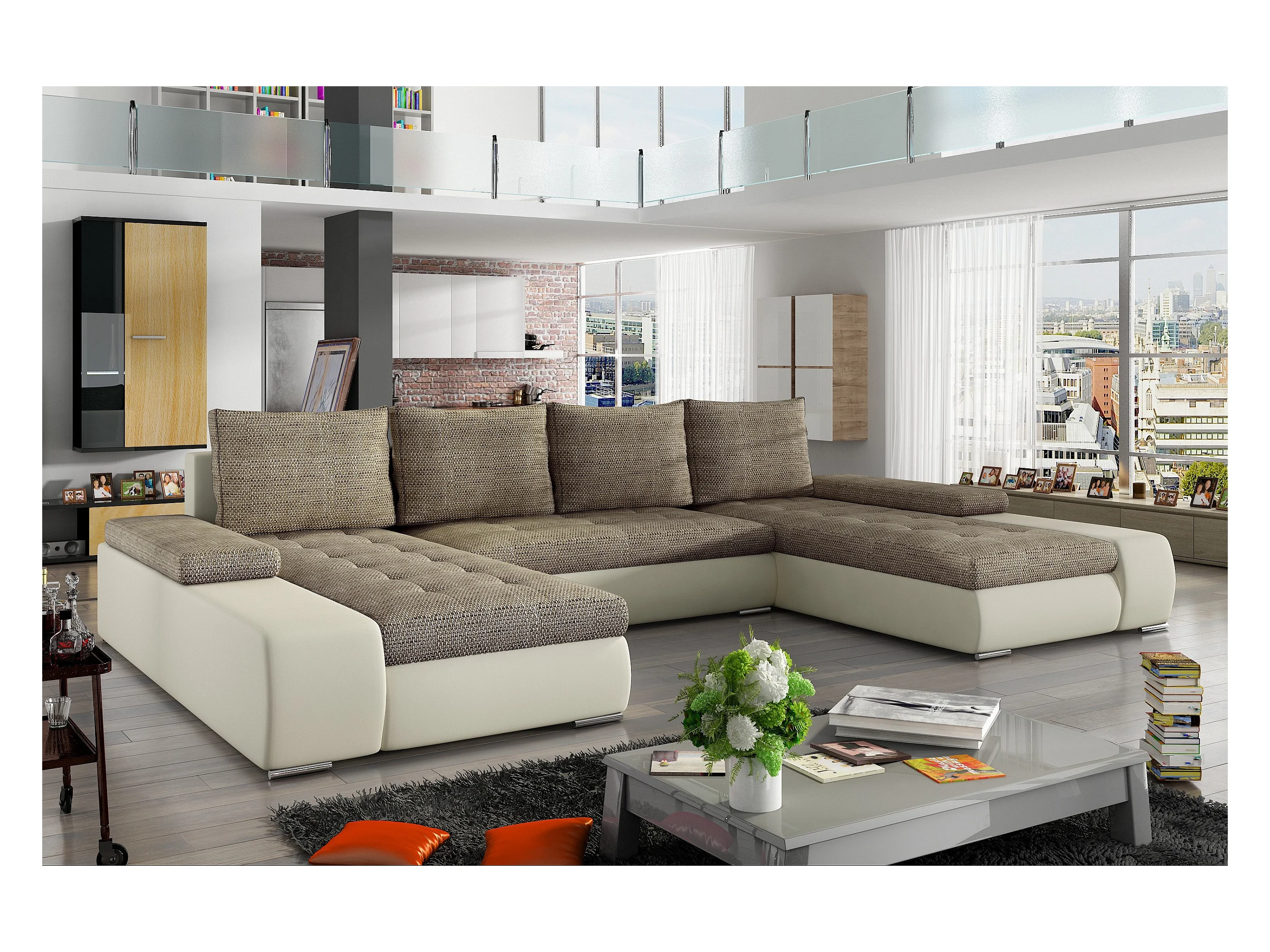 Grand canapé convertible panoramique design tissu beige chiné et simili cuir beige avec coffre de rangement Tino 363cm