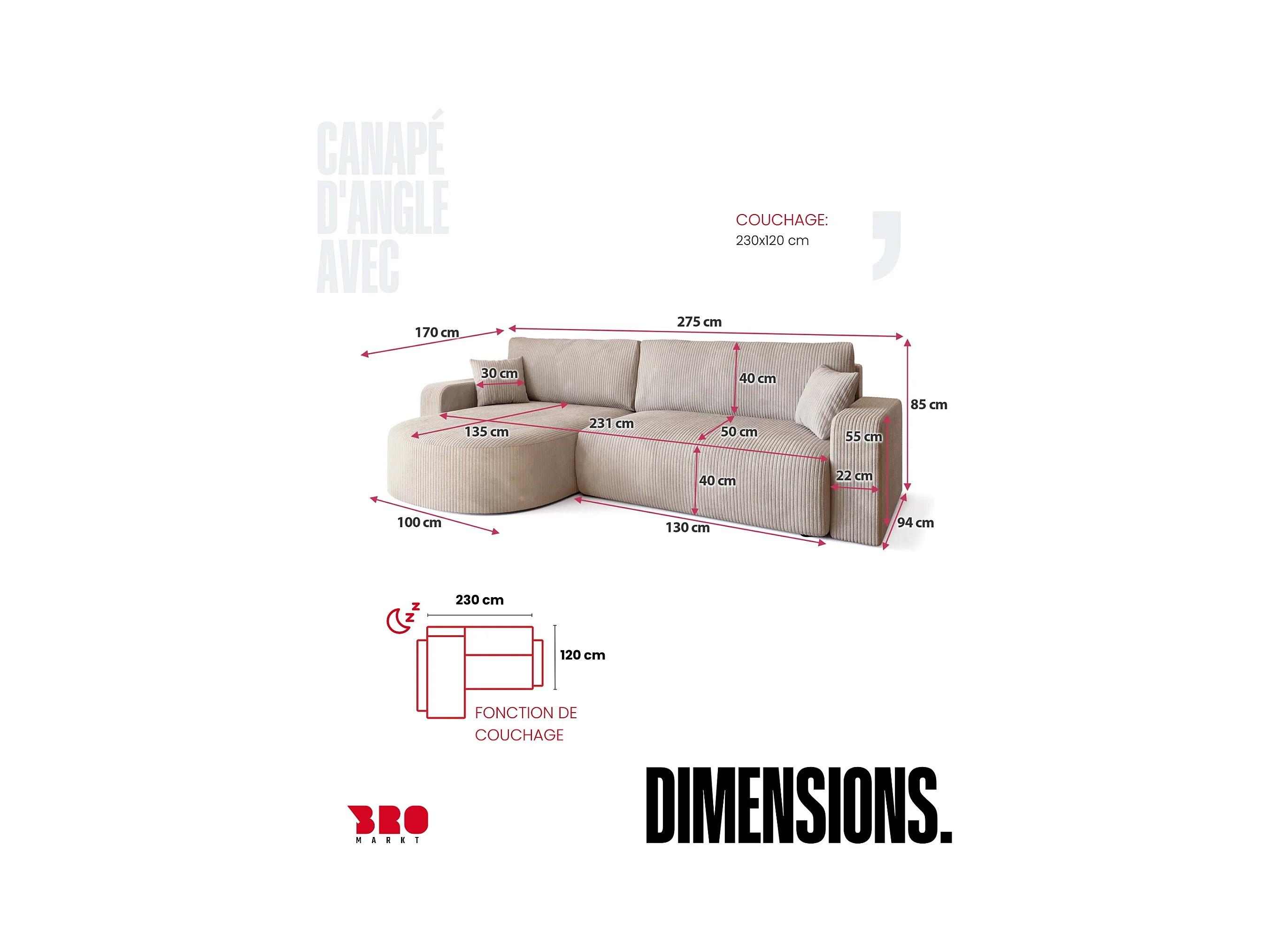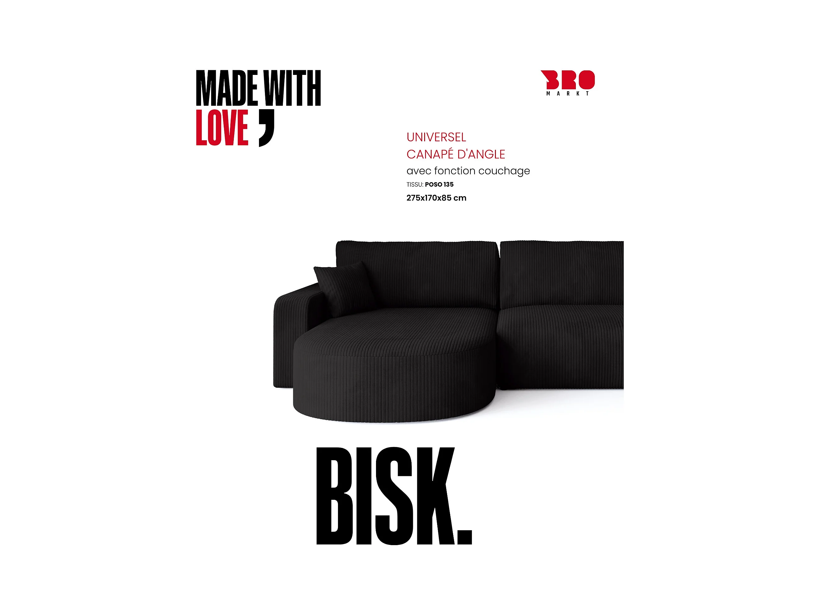 Grand canapé d'angle convertible, en velours côtelé noir BISK