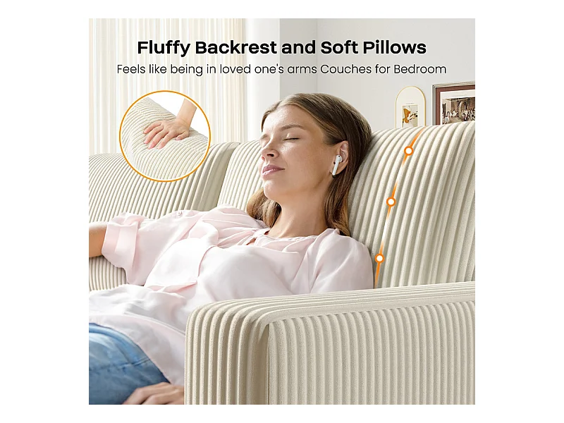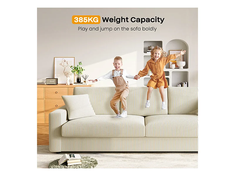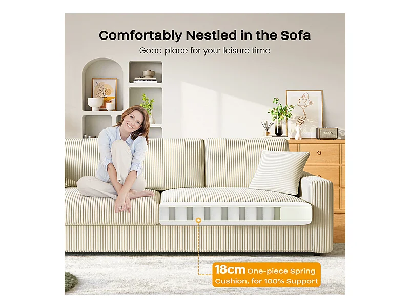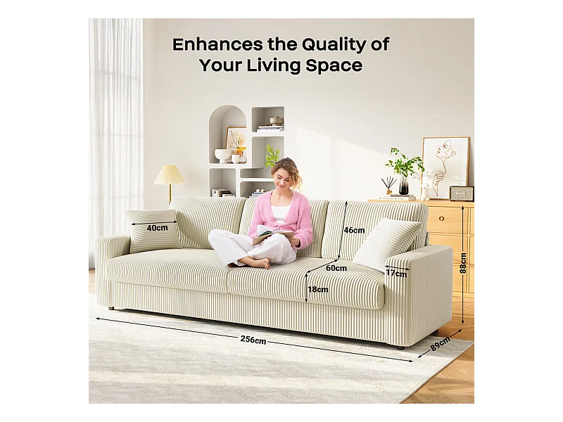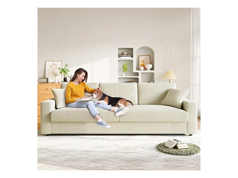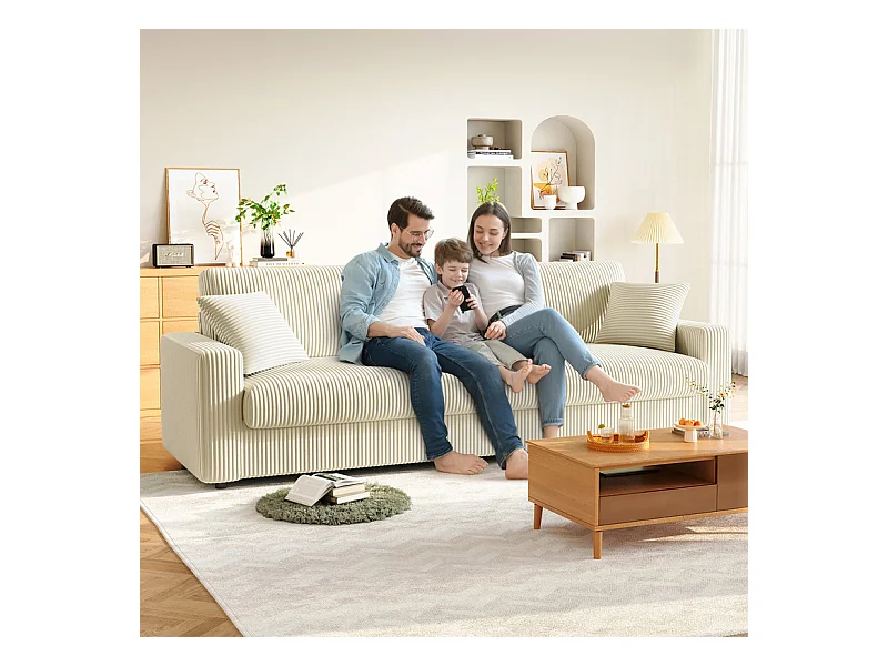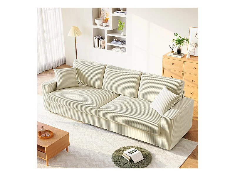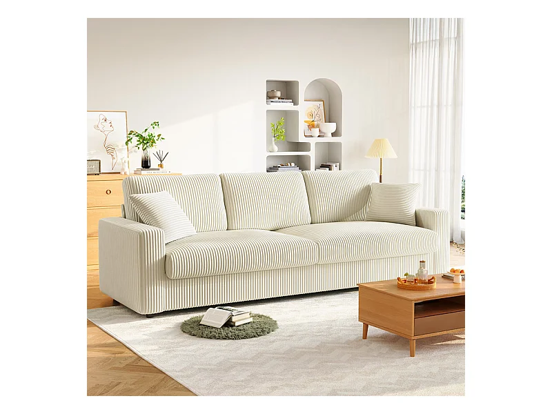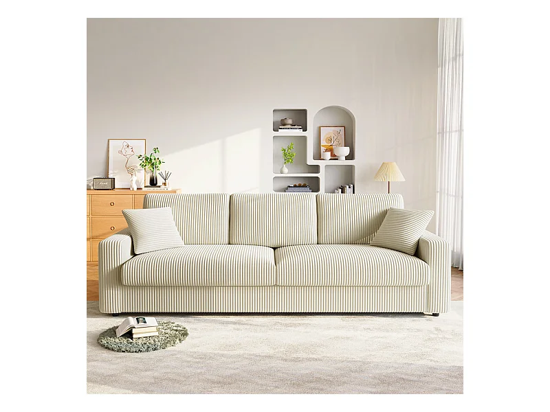 Grand canapé en velours côtelé avec 2 Oreillers - Beige - 256 x 89 x 88cm