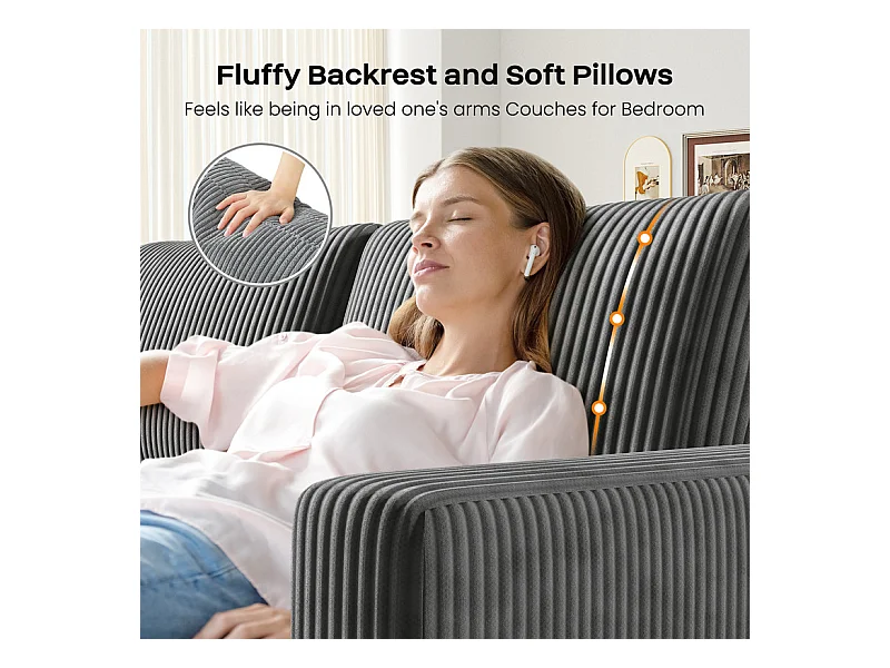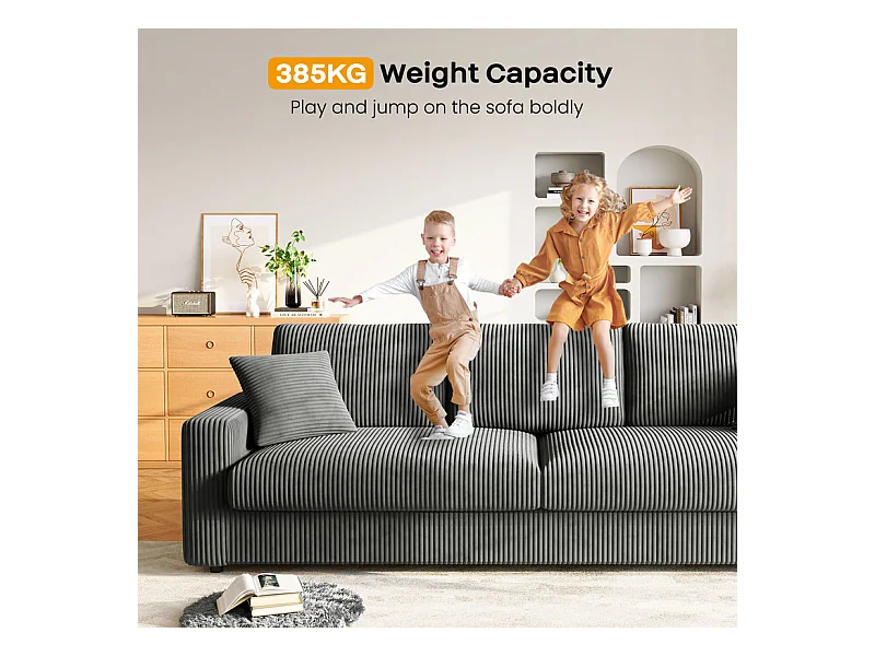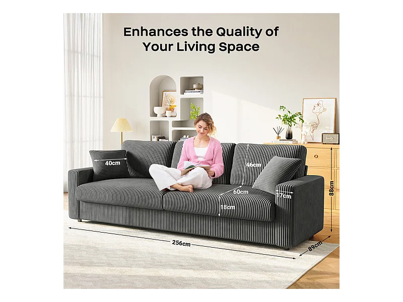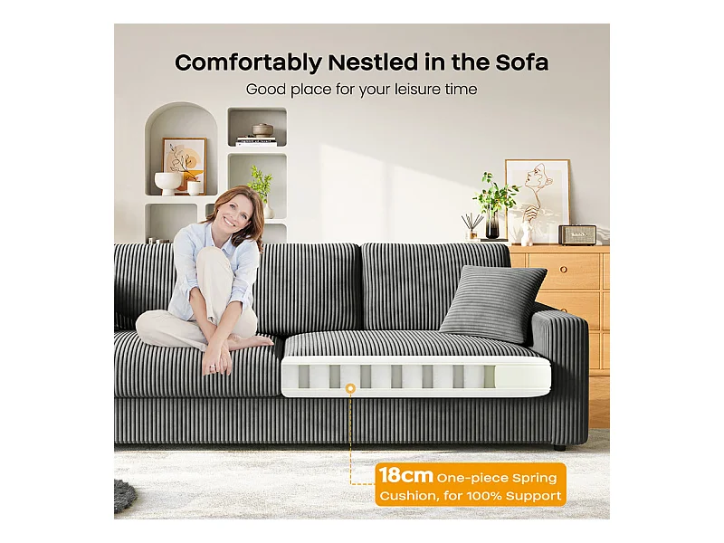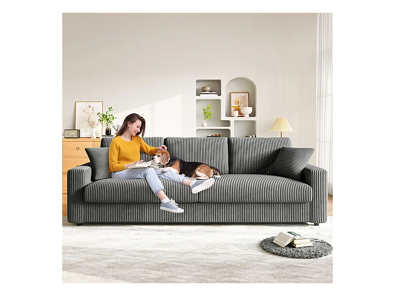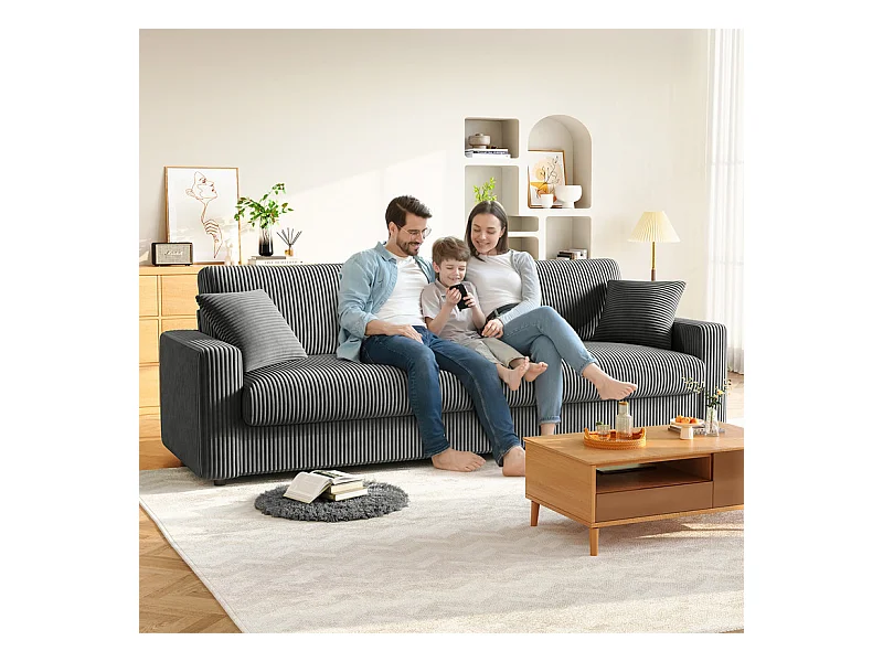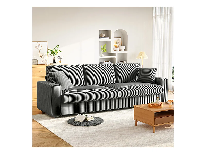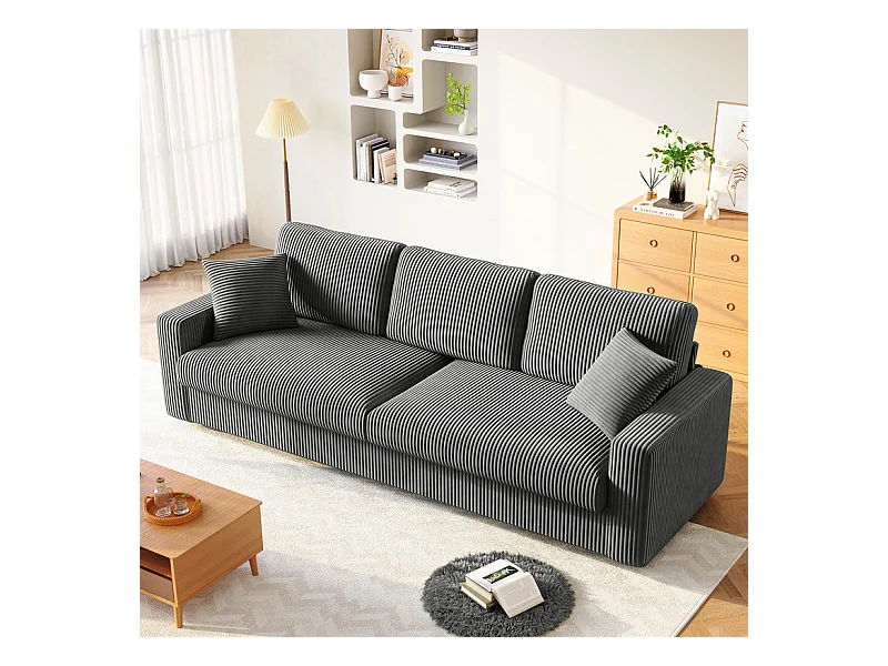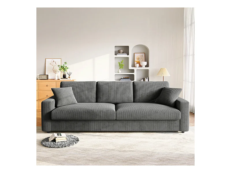 Grand canapé en velours côtelé avec 2 Oreillers - Gris - 256 x 89 x 88cm