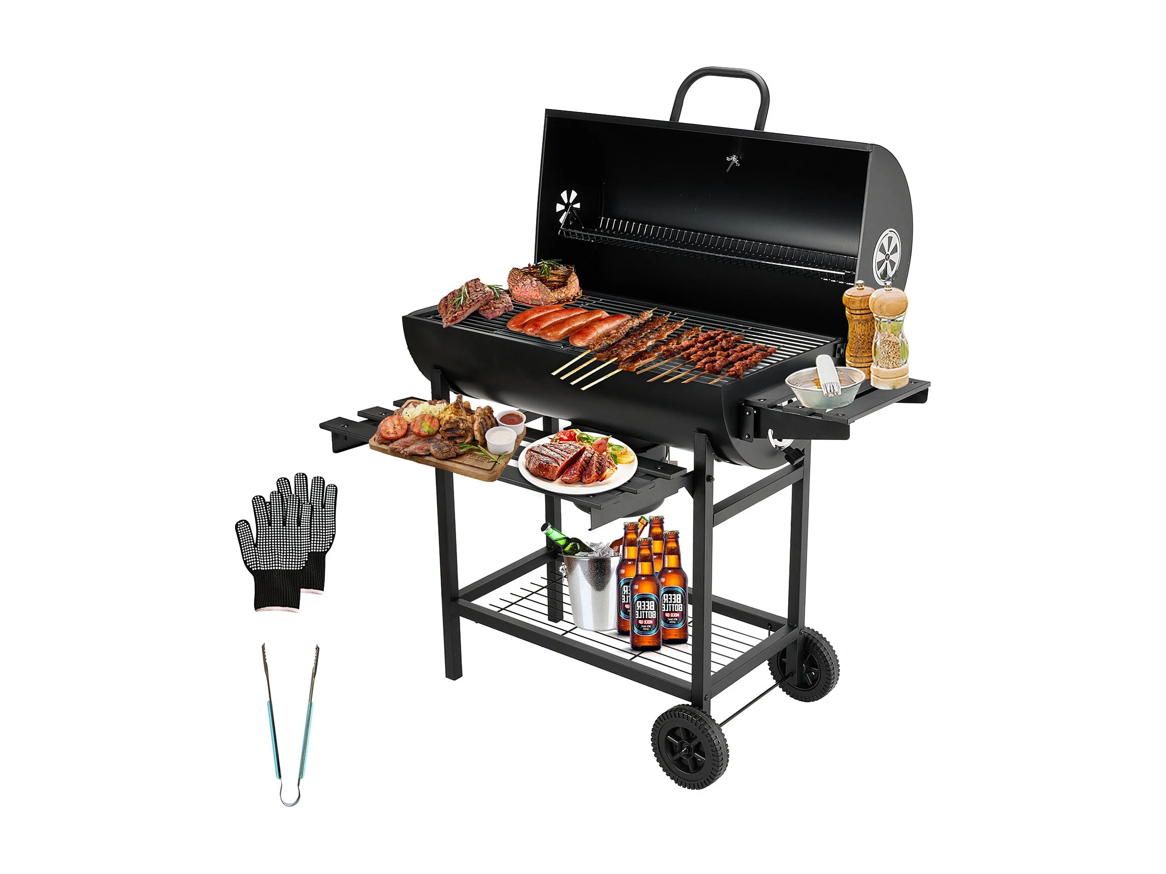 Gril à charbon de bois, gril à charbon de bois XXL avec couvercle, thermomètre, tiroir à cendres, gants anti-brûlure, évents réglables