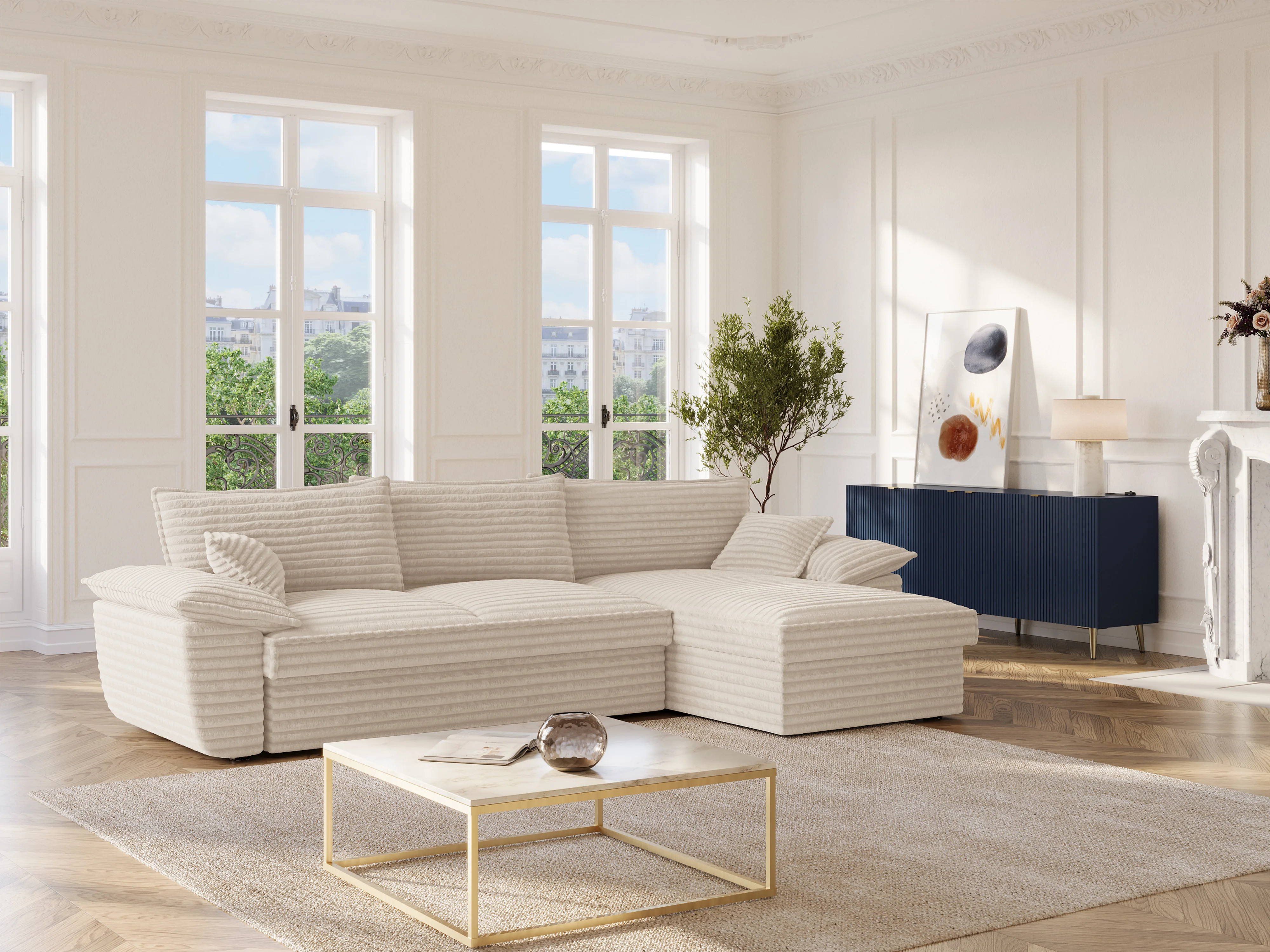Canapé d'angle droit convertible en velours côtelé grosses côtes beige GUILLERMO