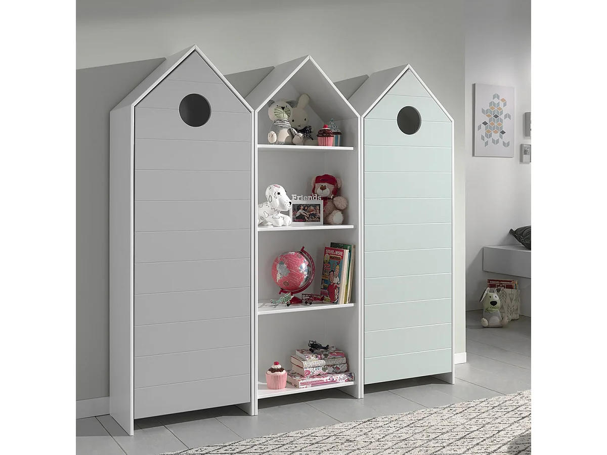 HAVRE - Pack Bibliothèque + 2 Armoires Verte et Grise