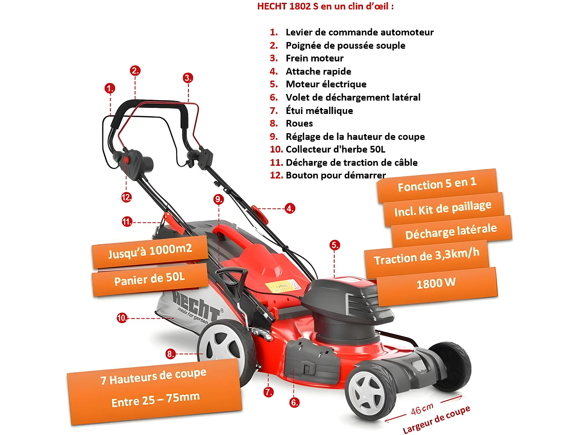Hecht 1802 S Tondeuse à gazon électrique 5en1 1800W largeur coupe 46cm bac 50L 7hauteur de coupe 25-75mm