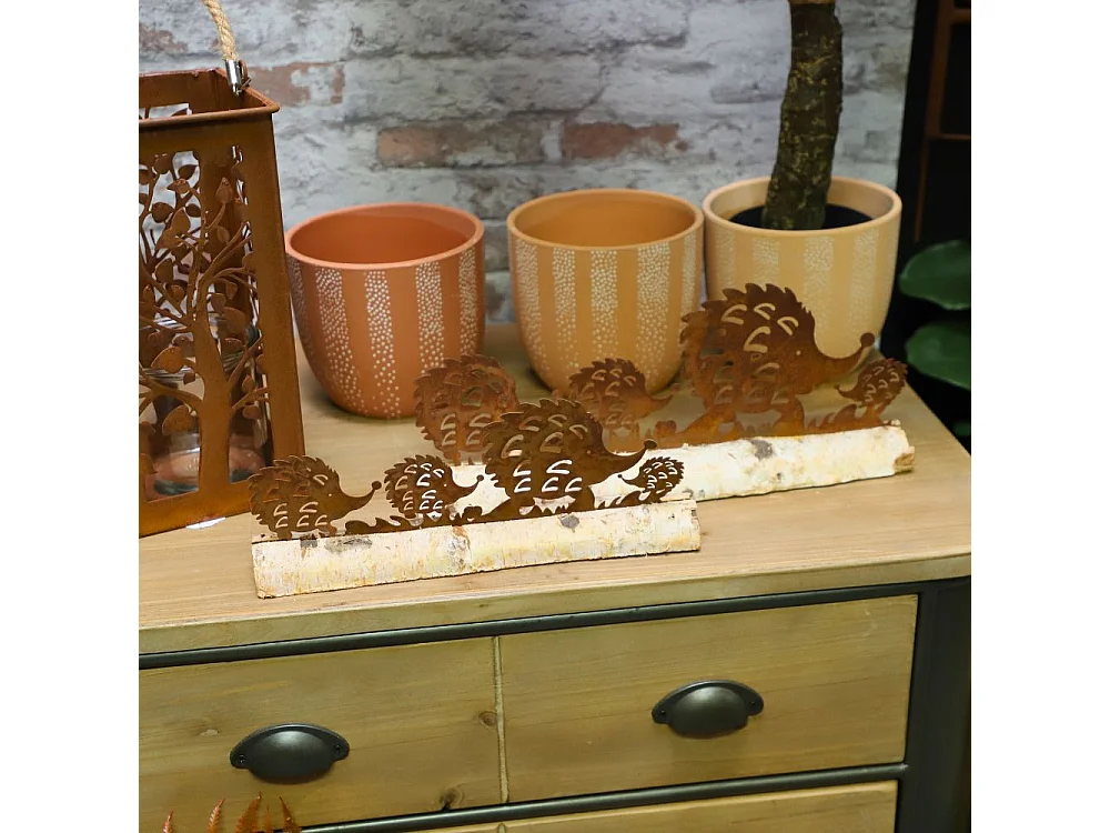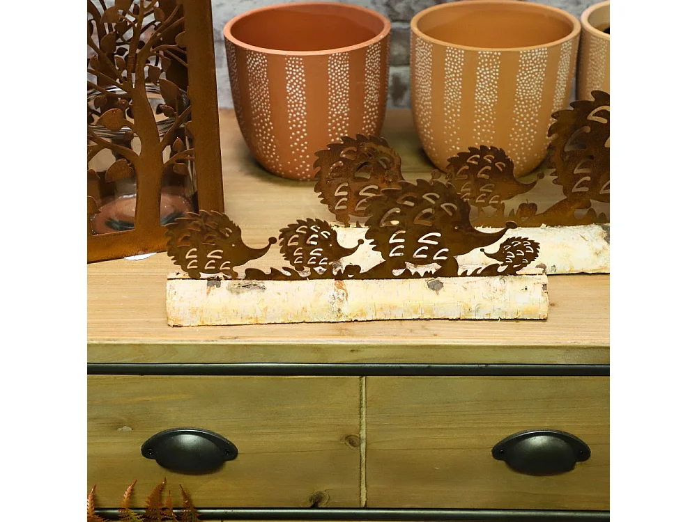 Hérisson statuette décoration jardin métal rouillé bois marron 40x14cm