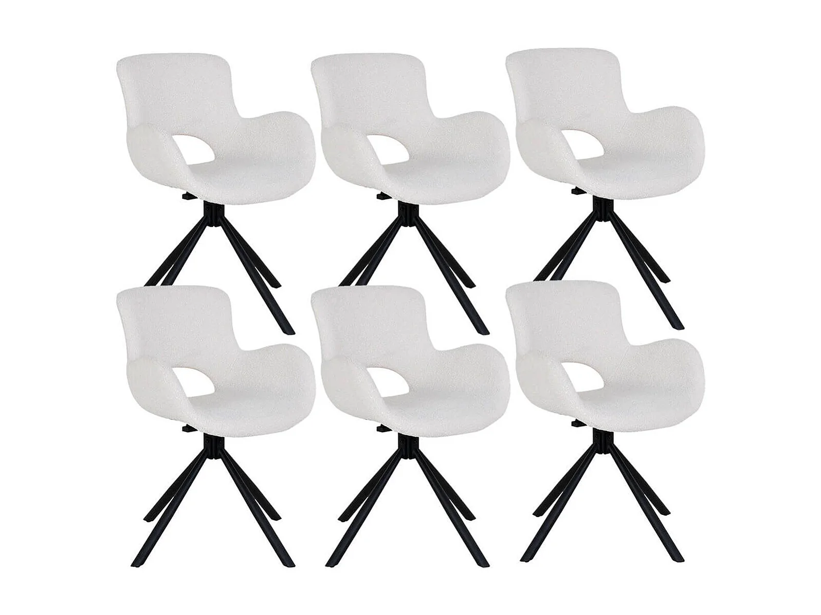 HERMOS - Lot de 6 Fauteuils de Table Tissu Bouclé Blanc Pied Pivotant Métal Noir