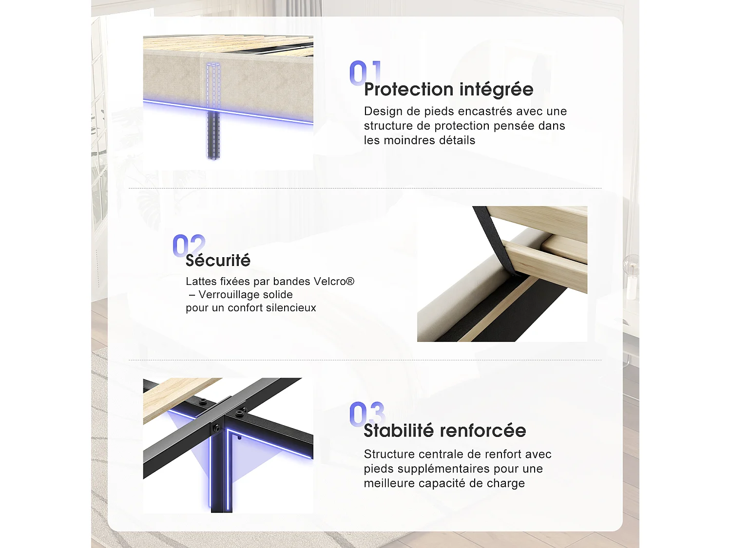 Hiazurm Lit - Lit Double 140x200 cm - Avec Tête de Lit en Velours de Luxe - Cadre en Acier Renforcé - Sommier à Lattes en Bois Massif