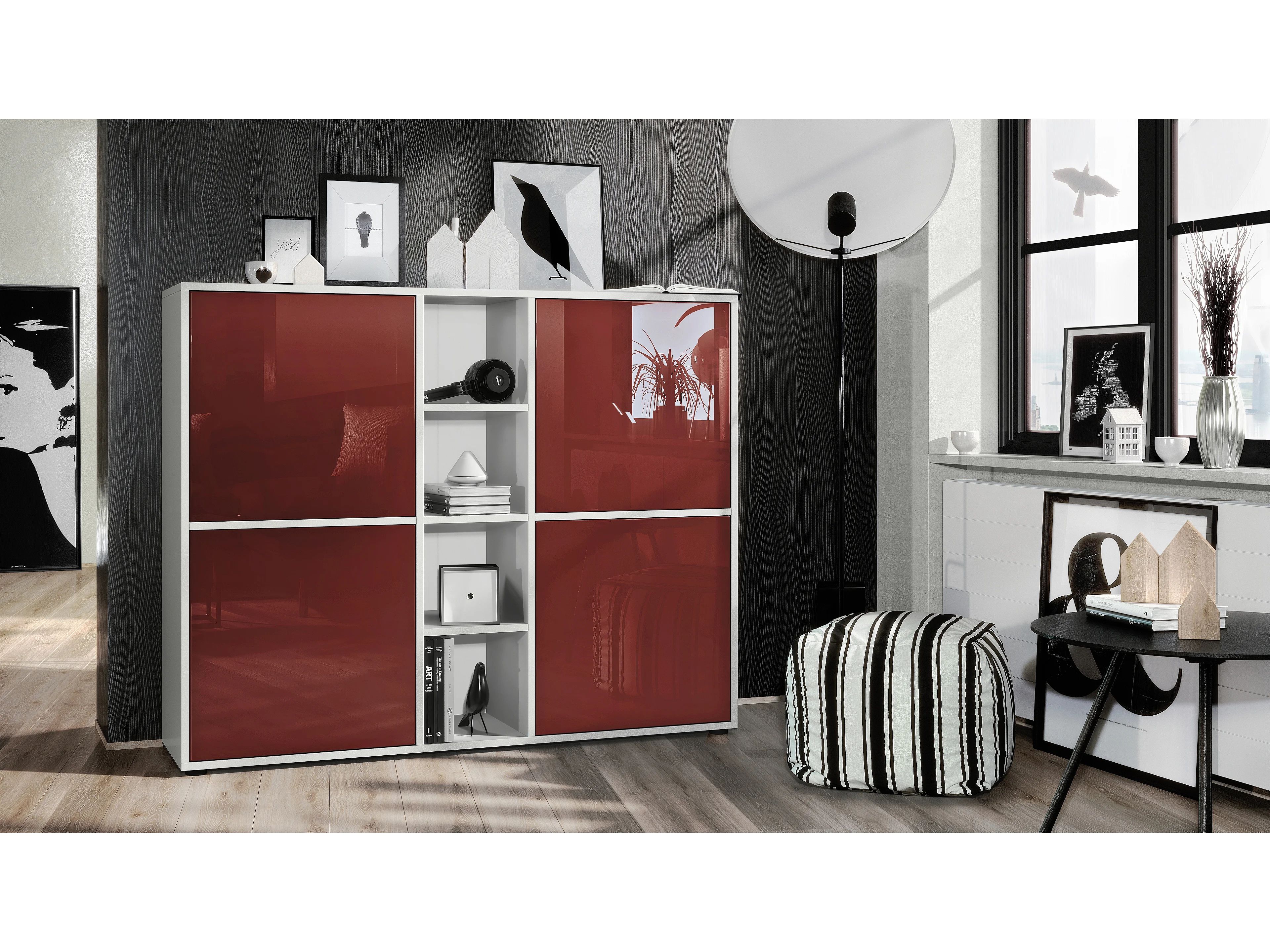 Highboard Cuba V3, blanc mat/bordeaux haute brillance - Buffet moderne à 12 compartiments (130,5 x 105,5 x 35,5 cm)