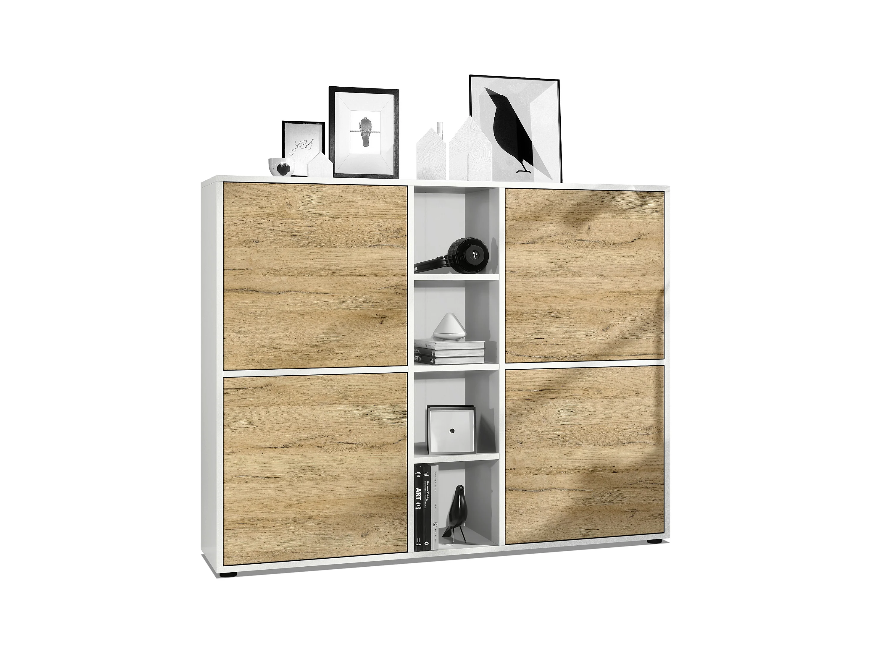Highboard Cuba V3, blanc mat/chêne nature - Buffet moderne à 12 compartiments (130,5 x 105,5 x 35,5 cm)