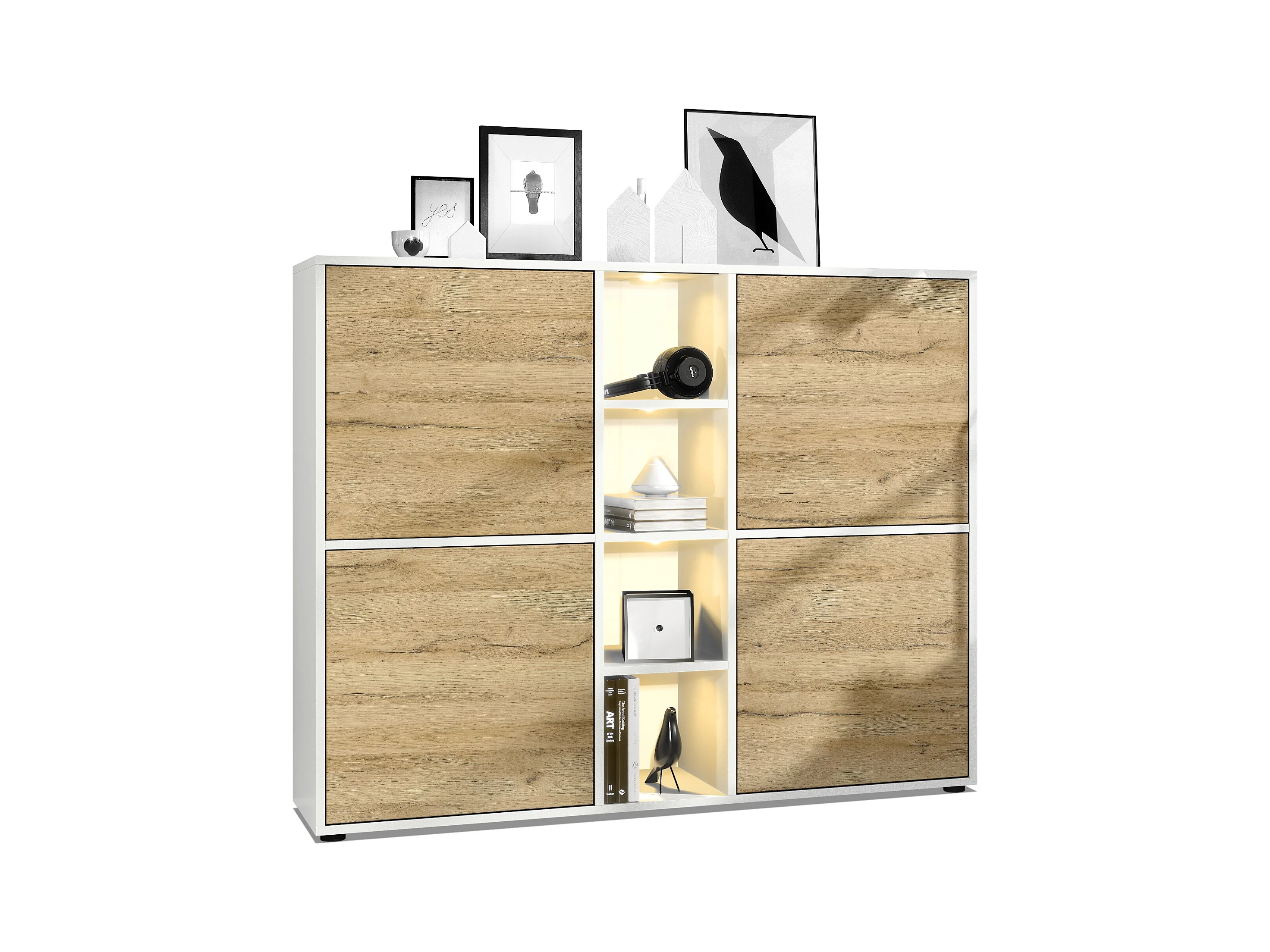Highboard Cuba V3, blanc mat/chêne nature y compris LED - Buffet moderne à 12 compartiments (130,5 x 105,5 x 35,5 cm)