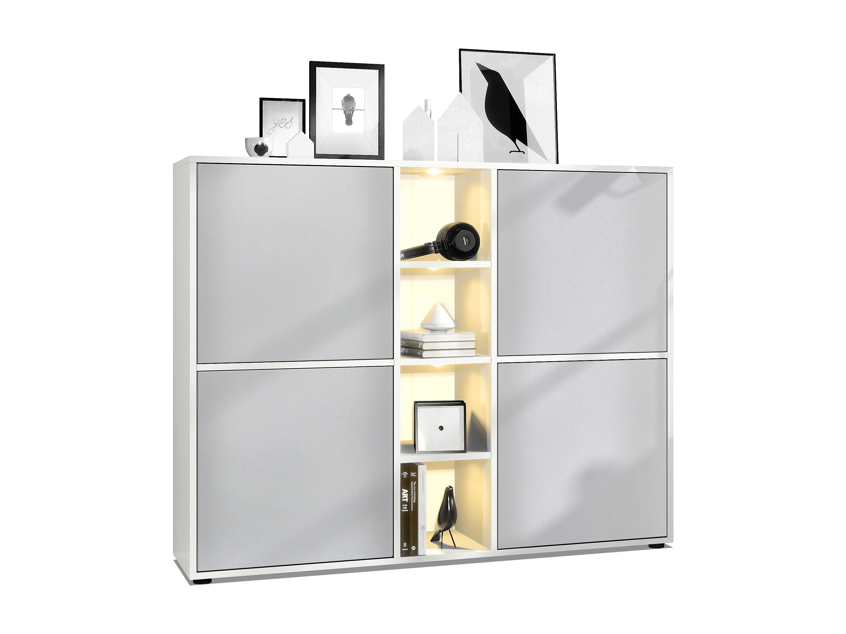 Highboard Cuba V3, blanc mat/gris clair satiné mat y compris LED - Buffet moderne à 12 compartiments (130,5 x 105,5 x 35,5 cm)